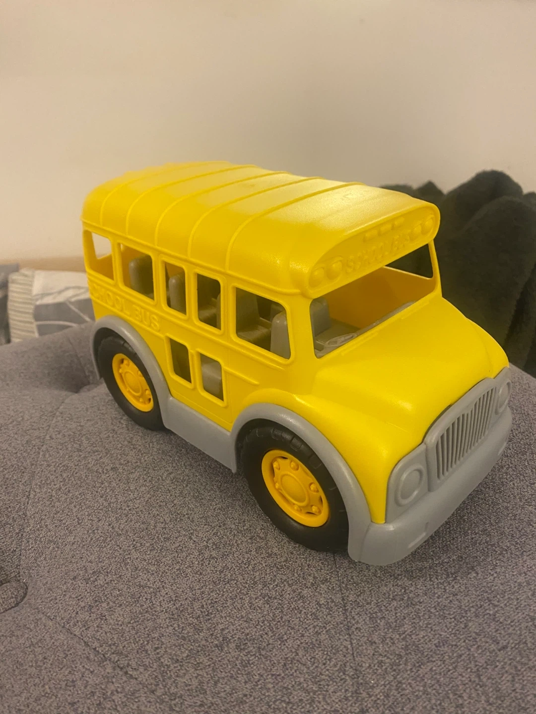 - Plastic school bus toy that rolls. Can fit little people inside on the seats. Great for play and very durable! Made from recyclable plastic