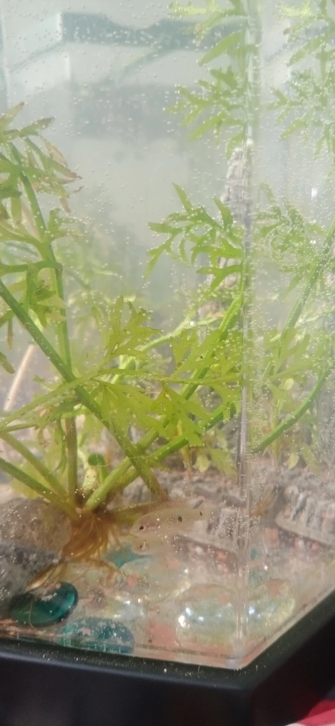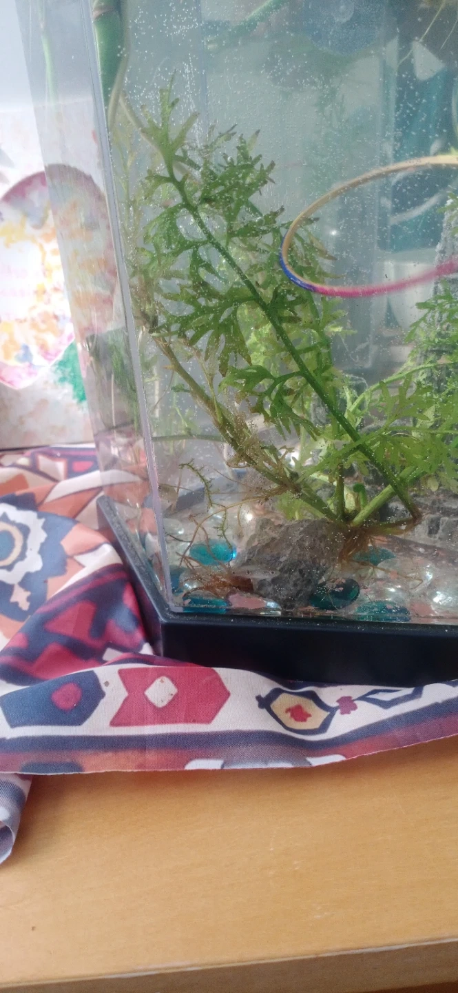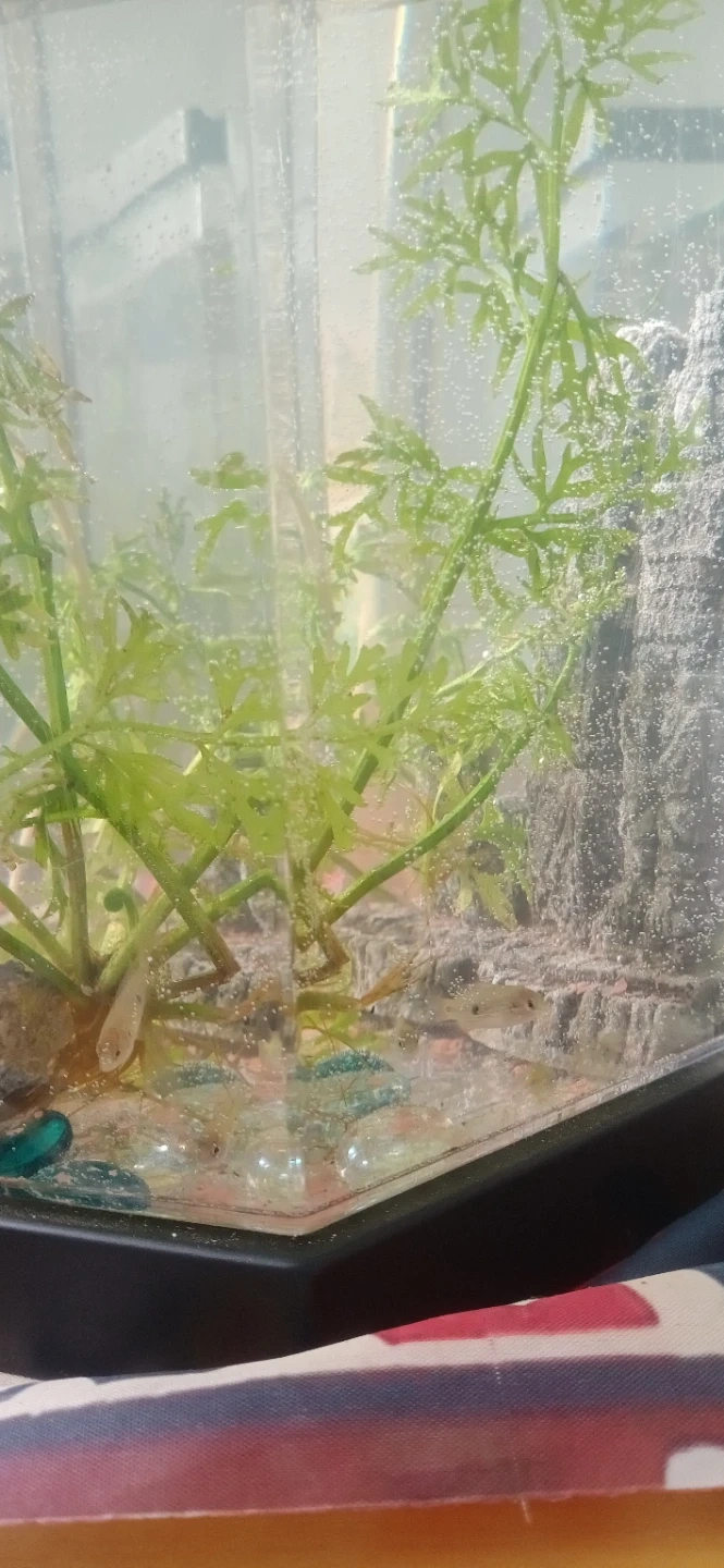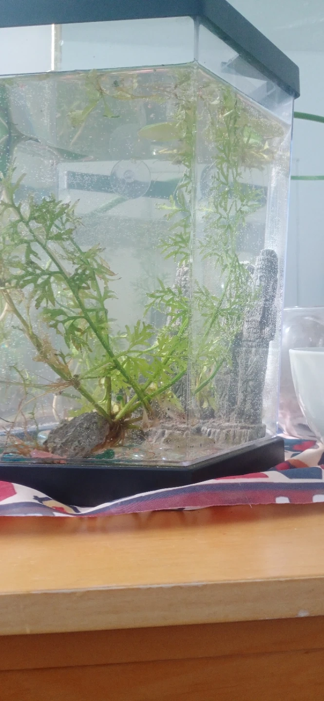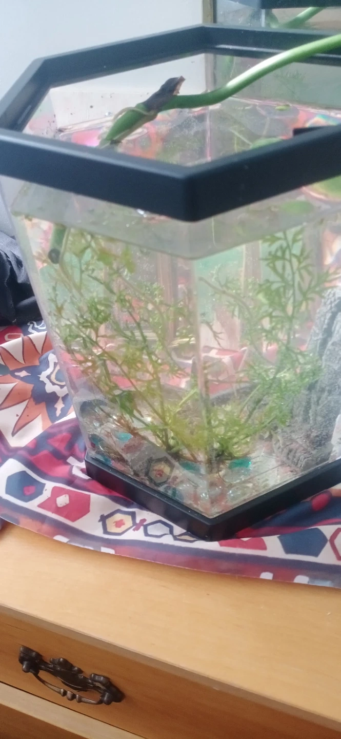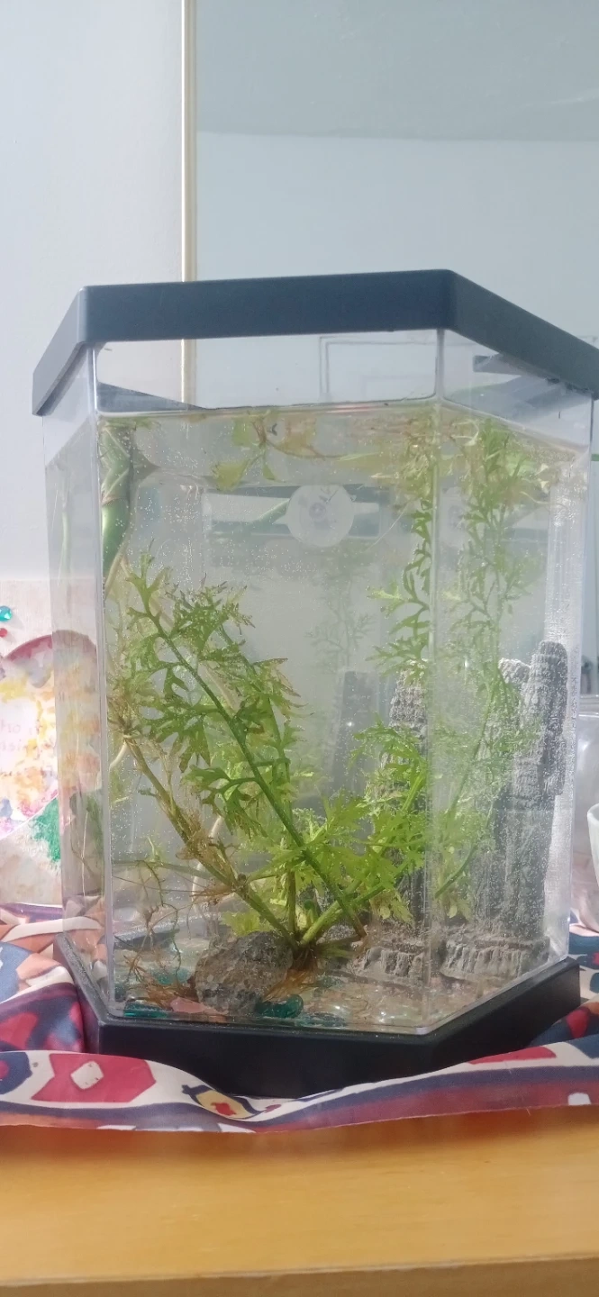 It's been carefully designed with gravel, an art piece, and aquatic plants which makes it a low tech aquarium.