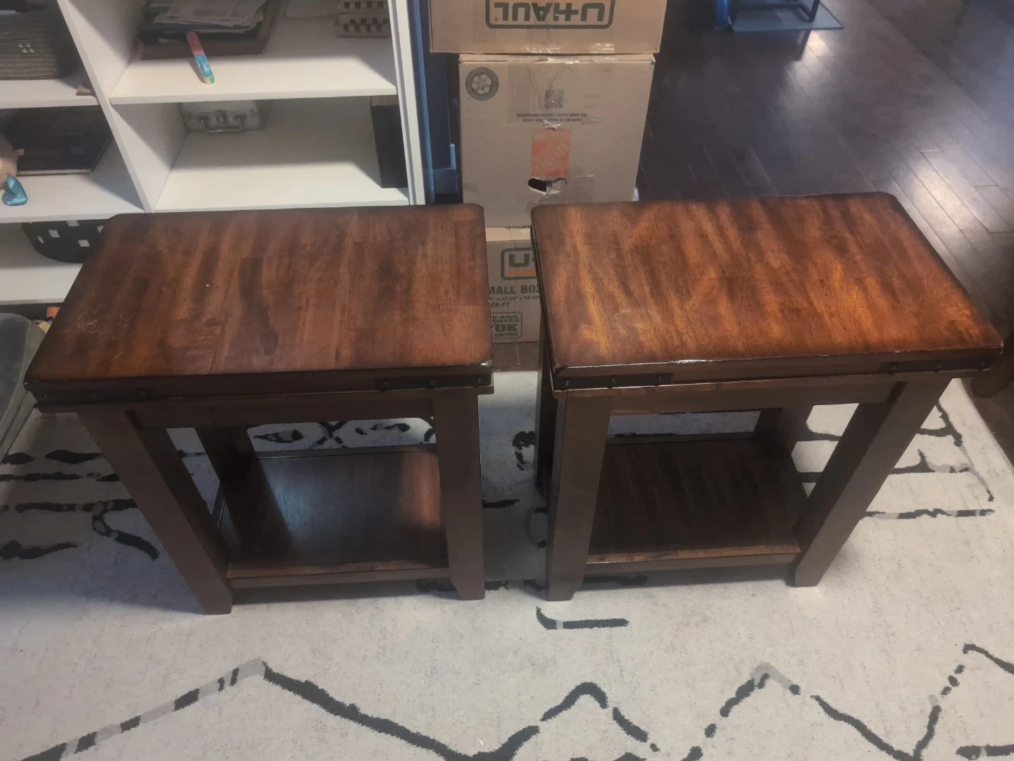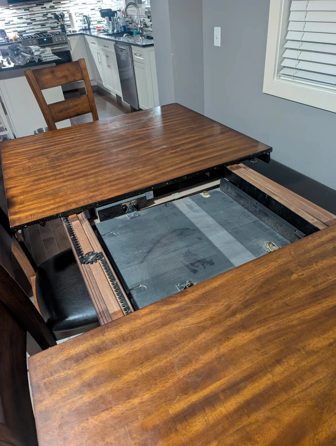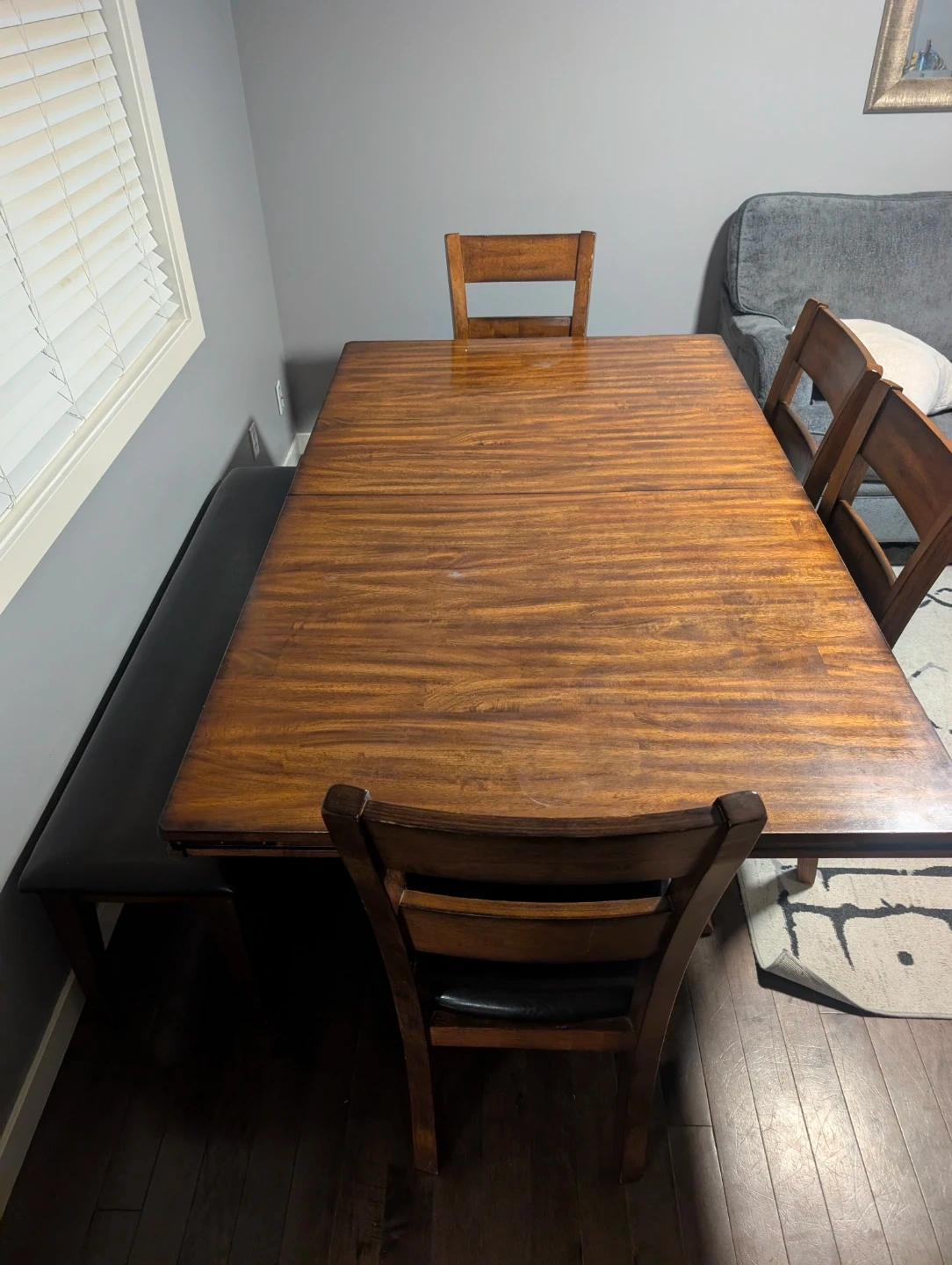 A rich brown wooden dining table with four matching chairs, each featuring upholstered black seats. This set includes one table and four chairs, large bench seating - perfect for family meals and two matching end tables. Table, chairs and end tables made of solid wood. In very good condition. A couple of faint water marks on table is the only damage.