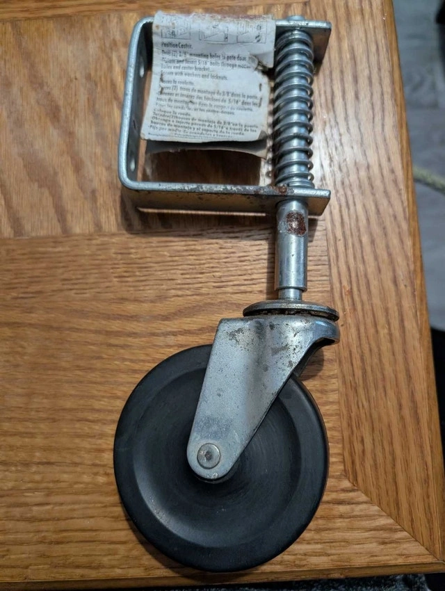 I'm selling a used gate caster with a spring-loaded mechanism and a sturdy rubber wheel, designed to assist in smooth gate operation. The caster measures 4 inches/102mm. It's in good working condition, ready to be installed for reliable support.