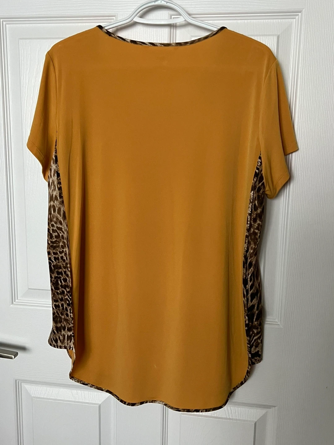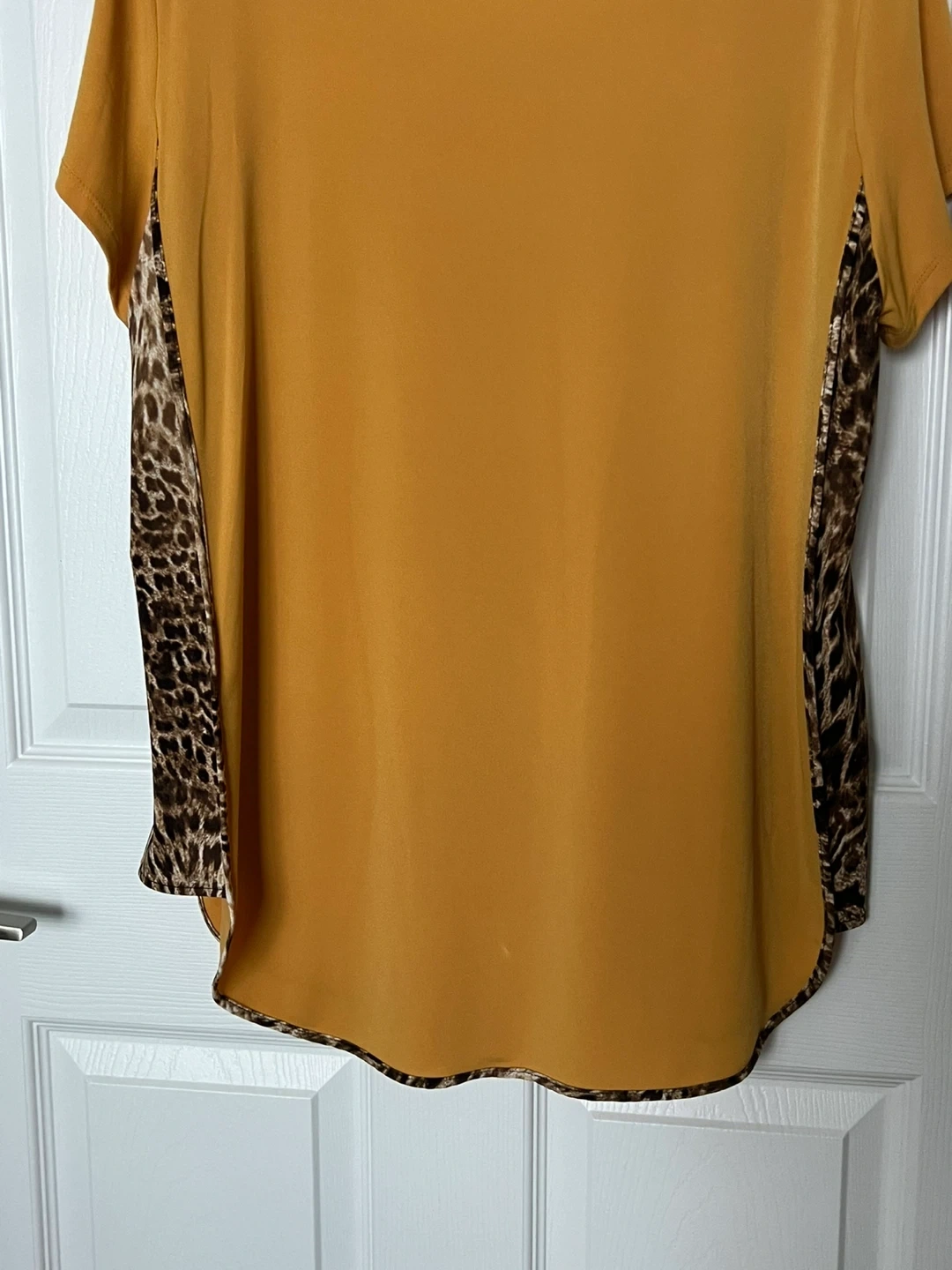 New without tags. Never been worn. Nygard short-sleeve top in a mustard yellow colour. It features contrasting leopard print panels on the sides. Made in Indonesia. Size M/M.