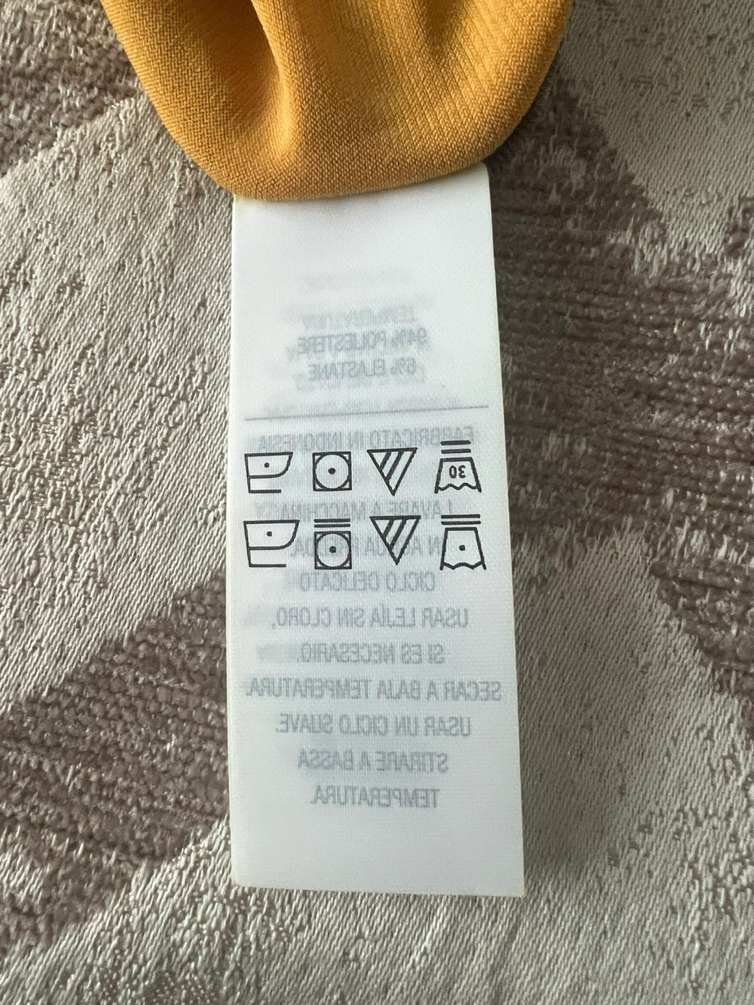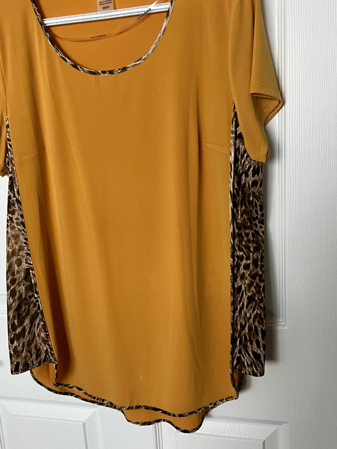 New without tags. Never been worn. Nygard short-sleeve top in a mustard yellow colour. It features contrasting leopard print panels on the sides. Made in Indonesia. Size M/M.