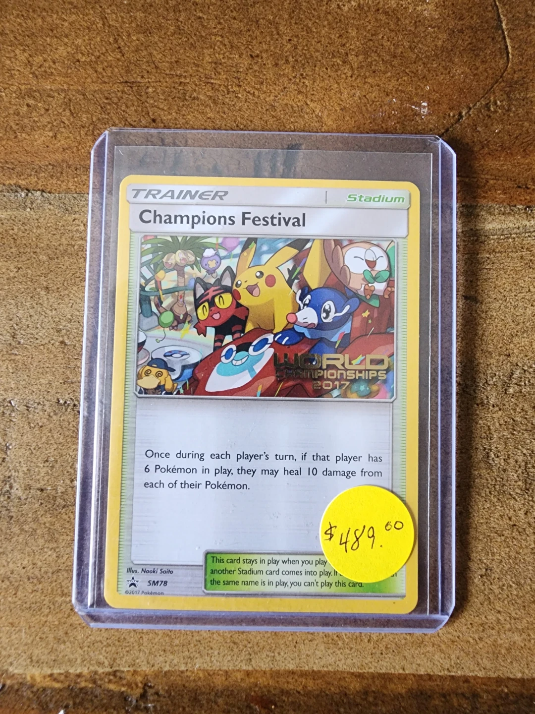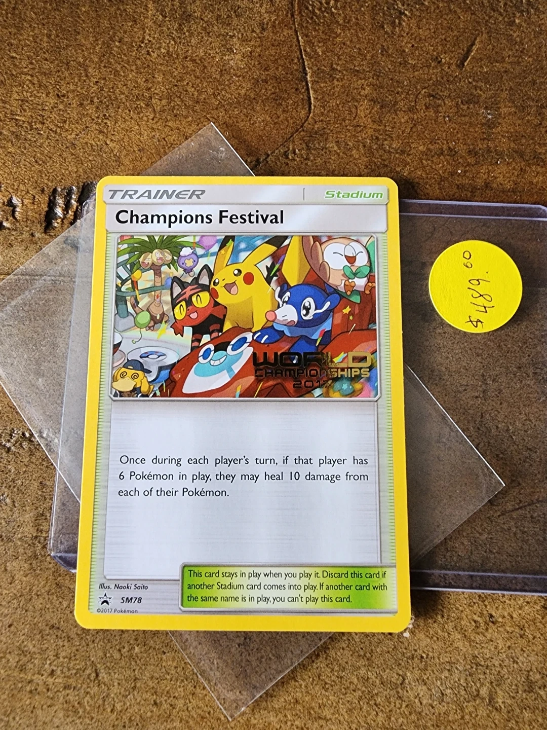 This is a Pokemon Champions Festival Trainer card. It's a Stadium card that can heal 10 damage from each of your Pokémon when you have 6 in play. If another Stadium card comes into play, this card is discarded.