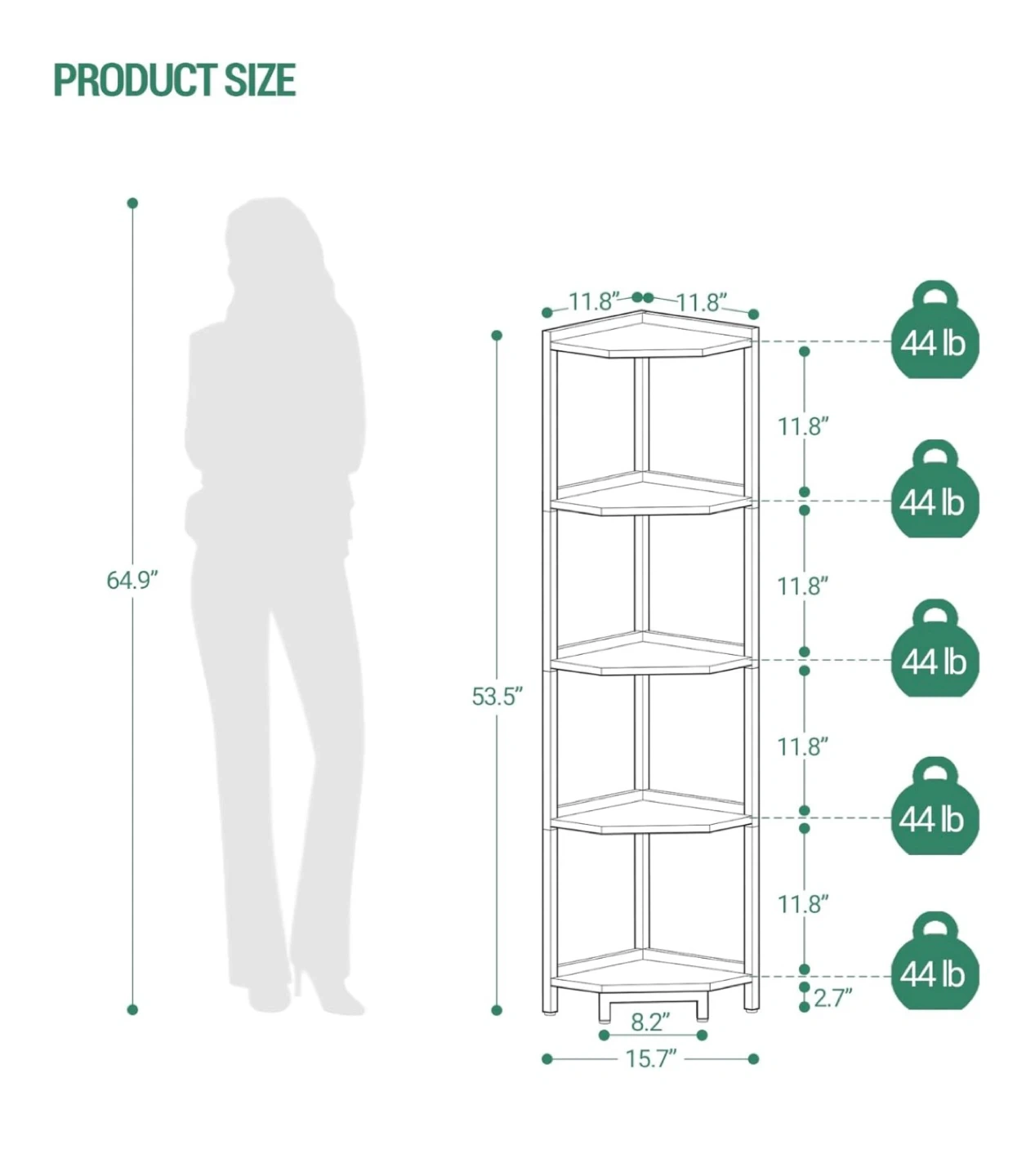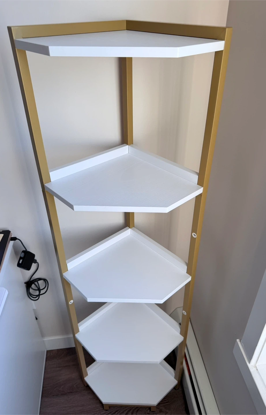 Add some stylish storage to any corner with this 5-tier corner shelf! It features a sleek gold frame with white shelves.