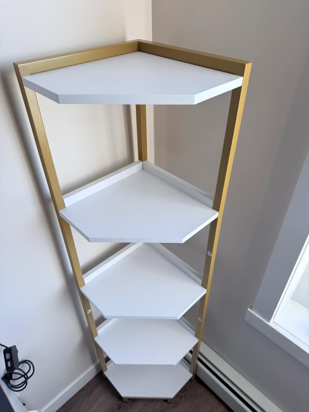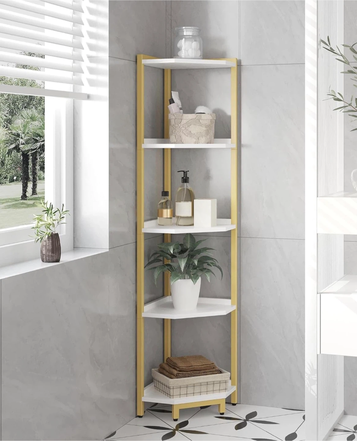 Add some stylish storage to any corner with this 5-tier corner shelf! It features a sleek gold frame with white shelves.
