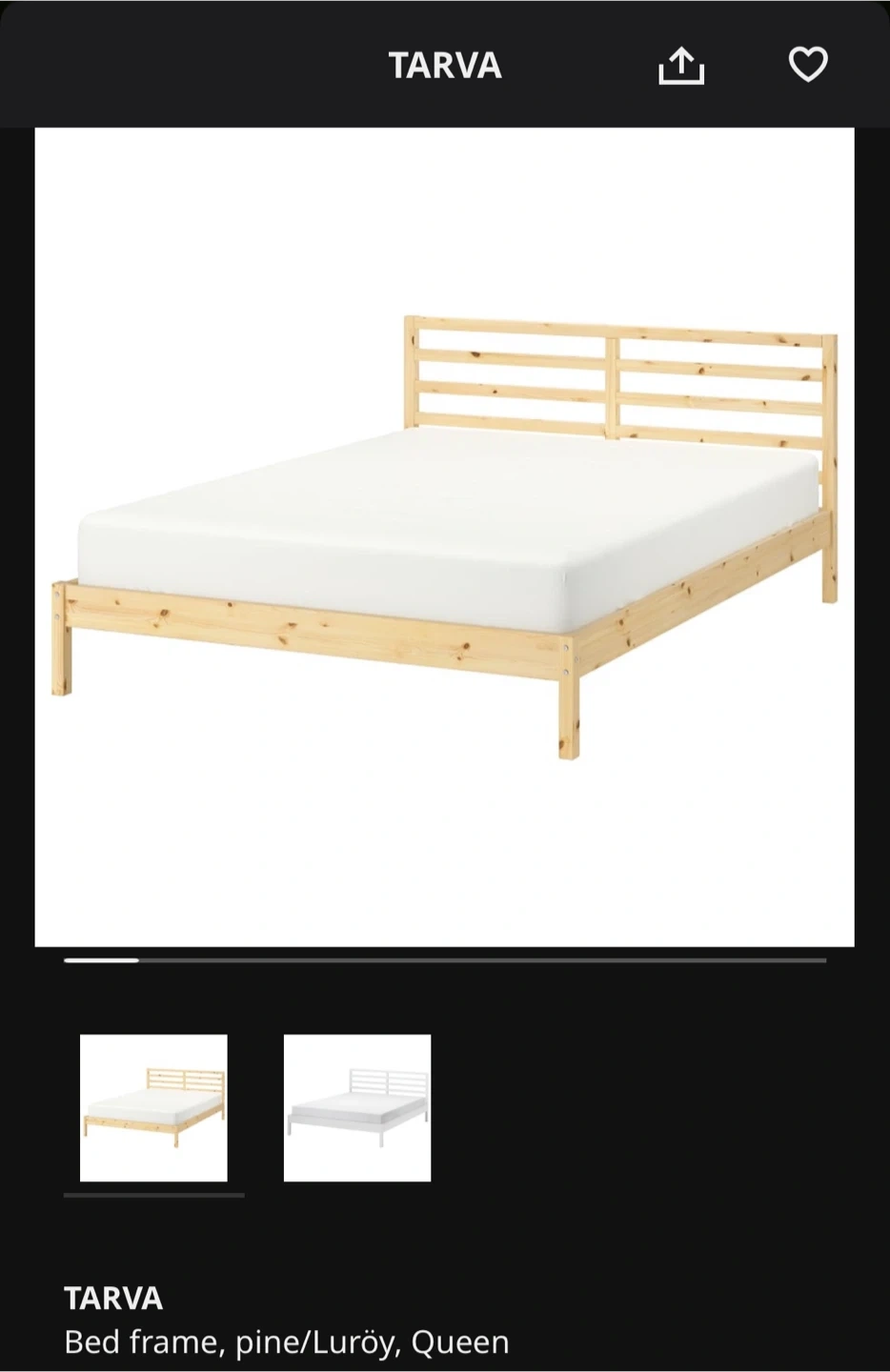 Selling an IKEA Tarva queen bed frame! It's made of pine and includes the Luröy slats. The dimensions are 209 cm (82 1/4") in length and 160 cm (63") in width. The headboard height is 92 cm (36 1/4"). Almost new like condition without any damages in a smoke and pet free environment.