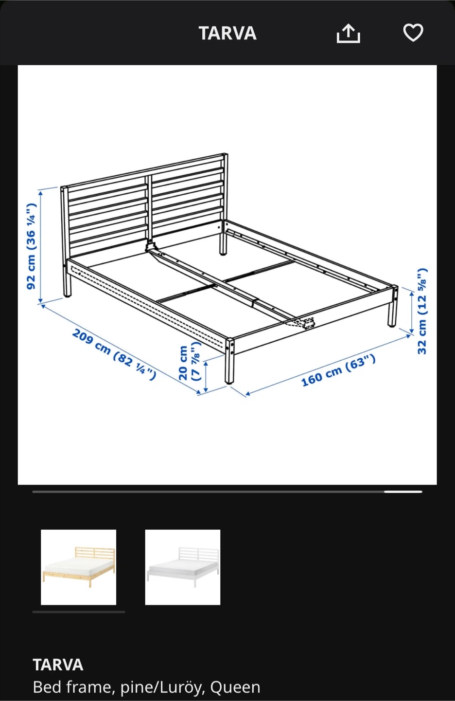 Selling an IKEA Tarva queen bed frame! It's made of pine and includes the Luröy slats. The dimensions are 209 cm (82 1/4") in length and 160 cm (63") in width. The headboard height is 92 cm (36 1/4"). Almost new like condition without any damages in a smoke and pet free environment.