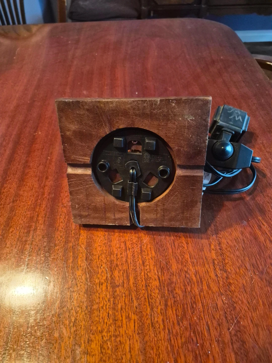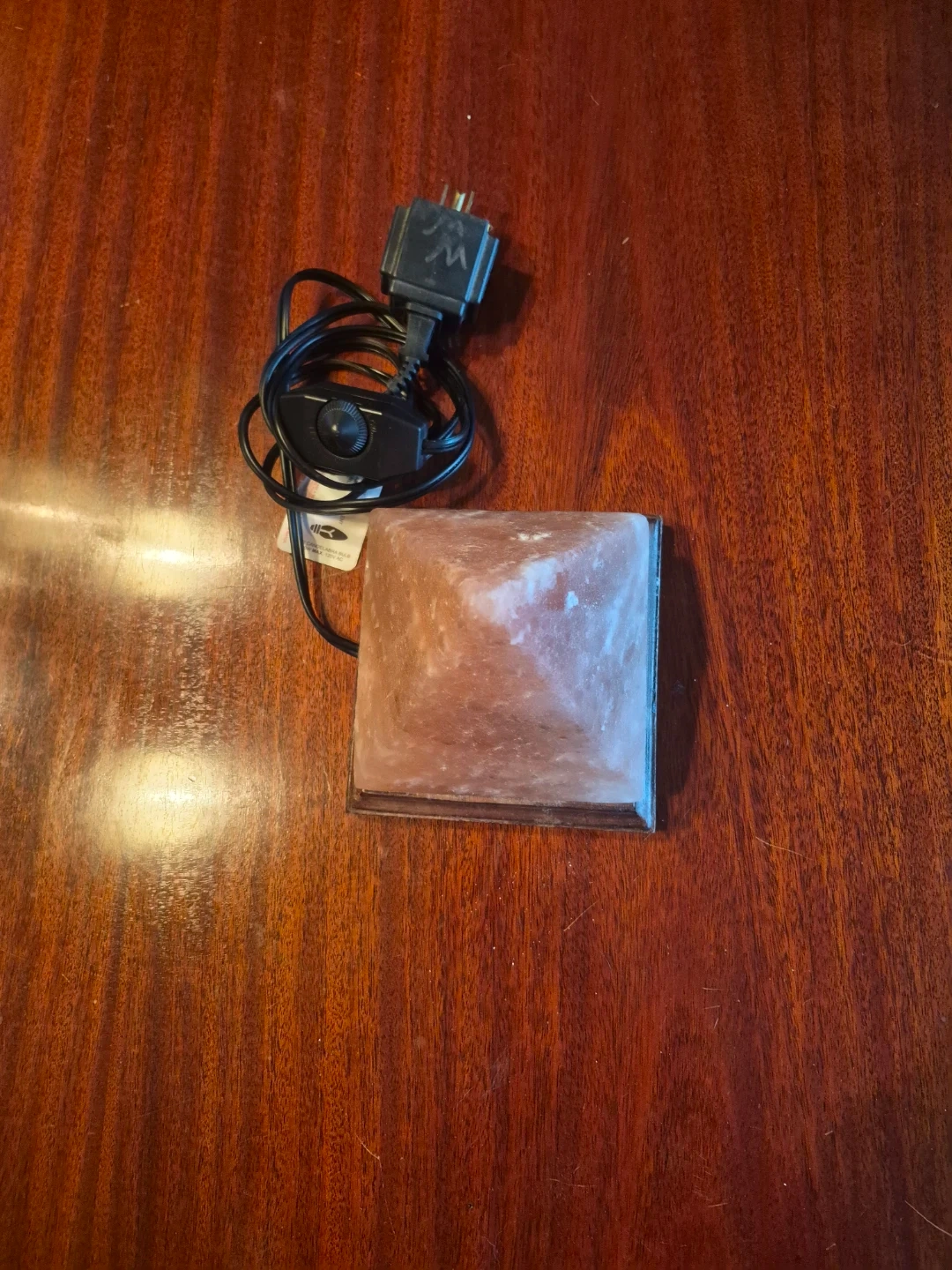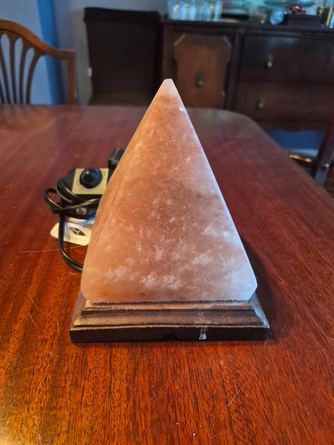 This pyramid-shaped Himalayan salt lamp sits on a wooden base. It's complete with a power cord and dimmer switch for adjustable brightness. Adds a unique ambiance to any room!