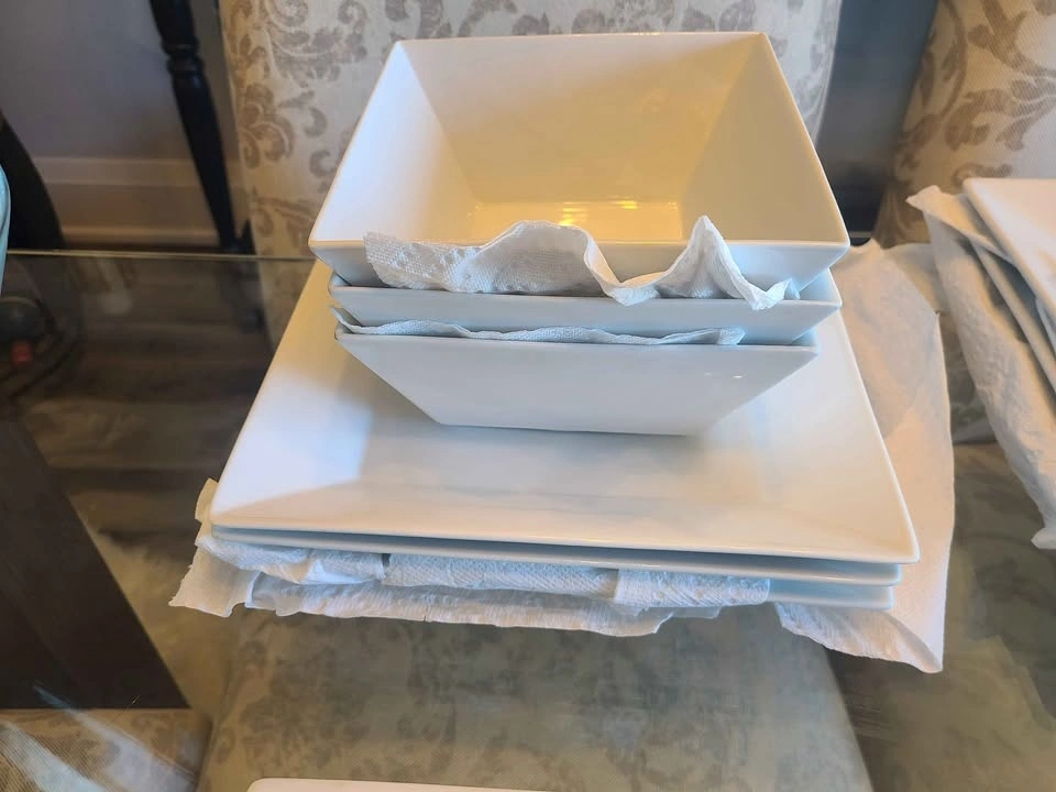 Up for sale is a beautiful dinnerware set with square plates, golden cutlery, water glasses, and much more. Everything you see in the pictures and video is included. Pickup is available at 2310 Derry Road West, Mississauga, ON L5N 2R4. Feel free to message if you have any questions!