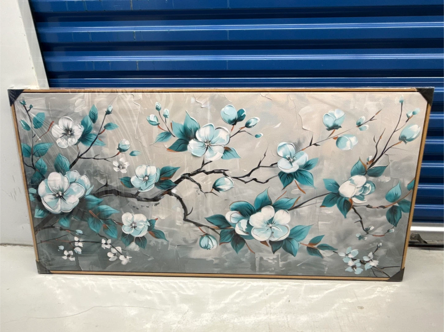 Adorn your living space with this brand new, sealed rustic flowers wall decor, sized at 60cm x 120cm, featuring an elegant floral design with teal leaves on a grey backdrop. It's a sophisticated and modern piece of art. Below are the specs: