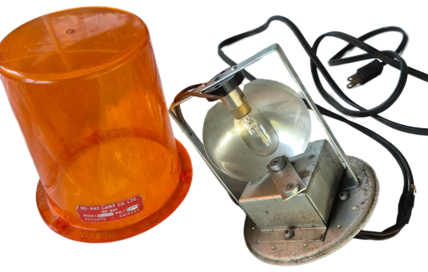 DO-RAY Lamp Co. Ltd. Model 552 rotating beacon light. Features an orange plastic dome and a metal base with a bulb and cord. This light would be useful for signalling or as a warning light.
