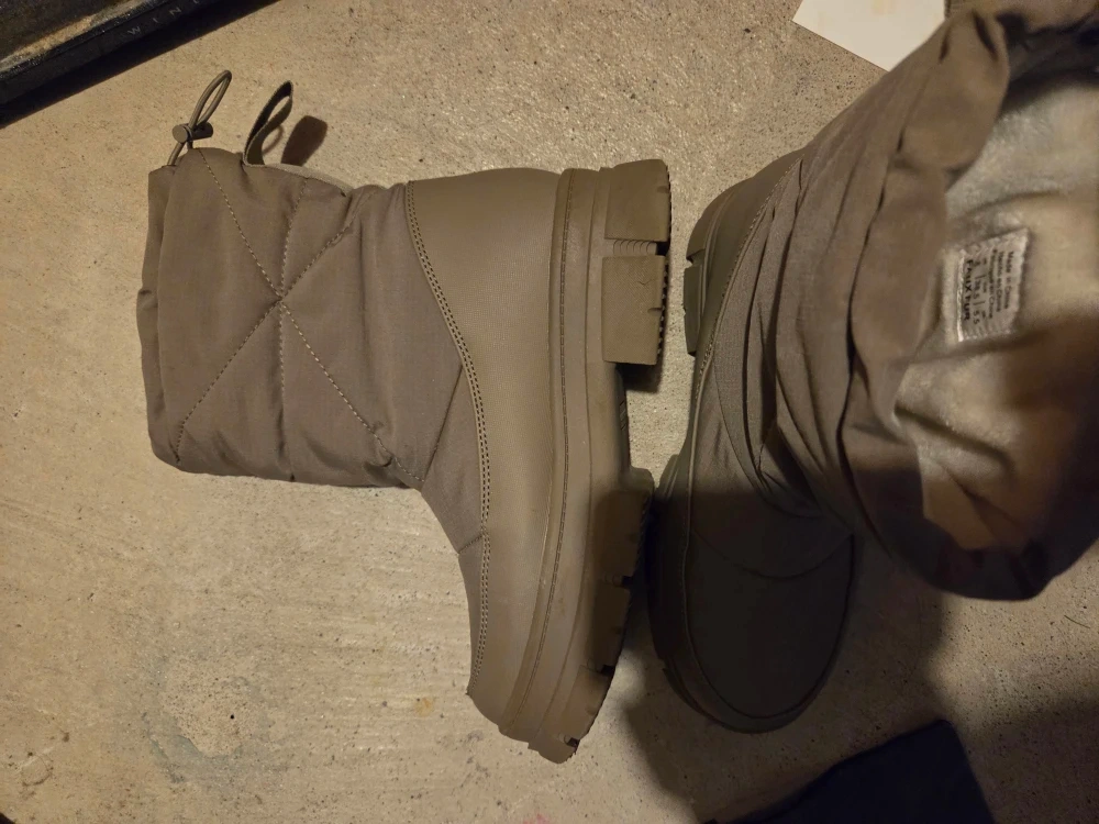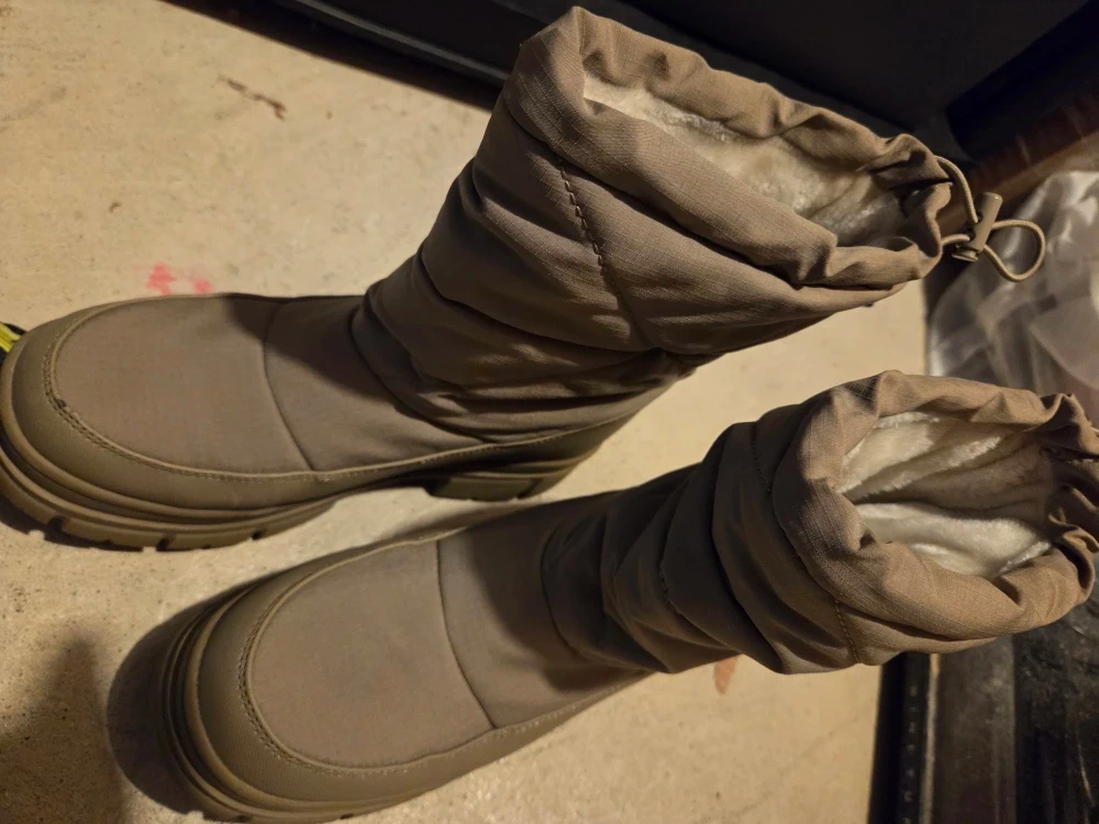 These tan winter boots are lined with faux fur to keep your feet warm. They feature a drawstring at the top for a snug fit. Size US 8.