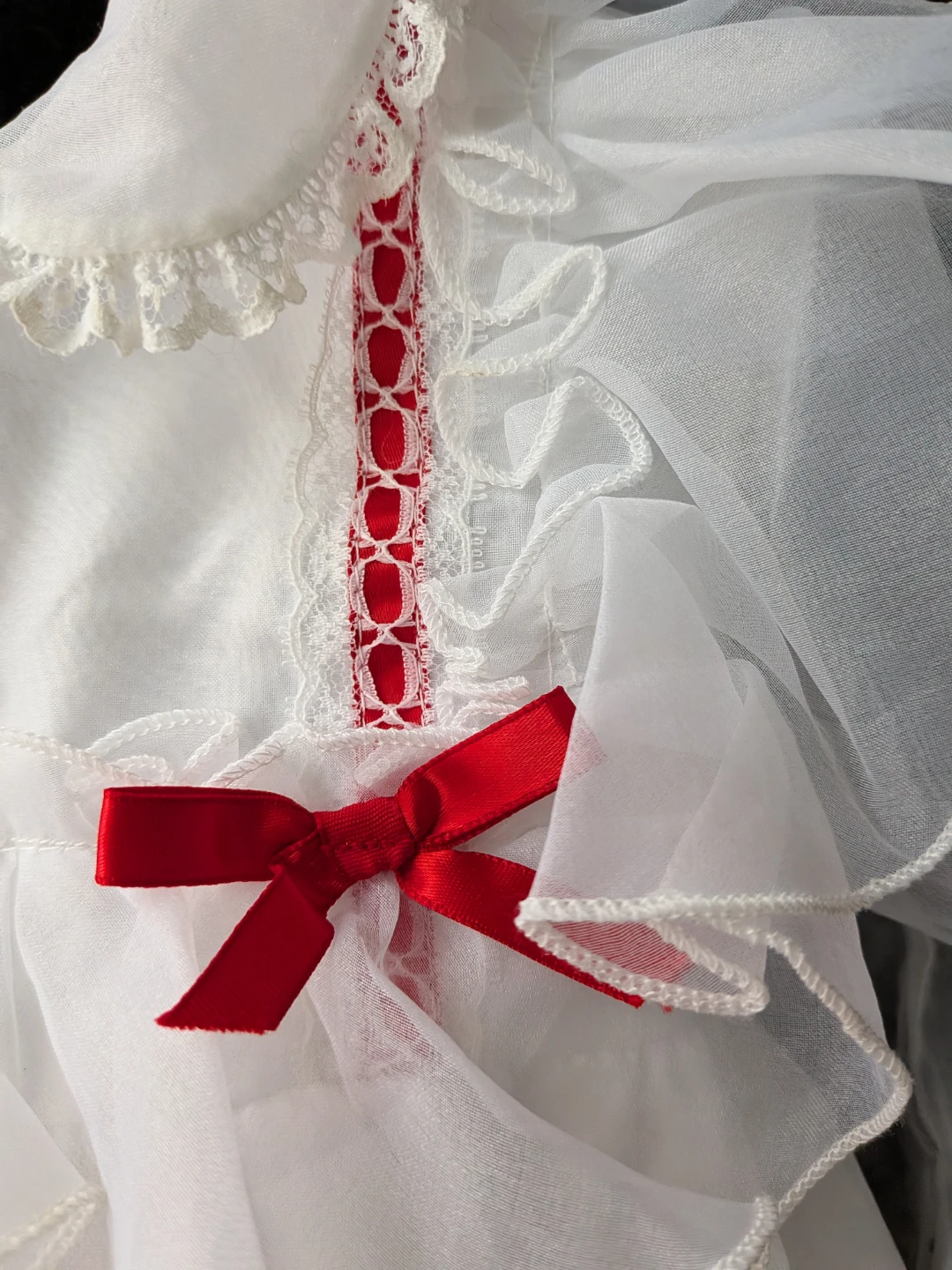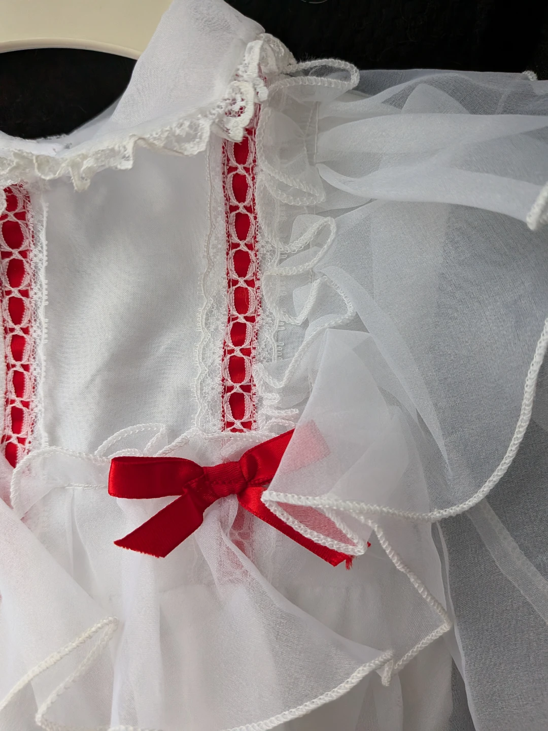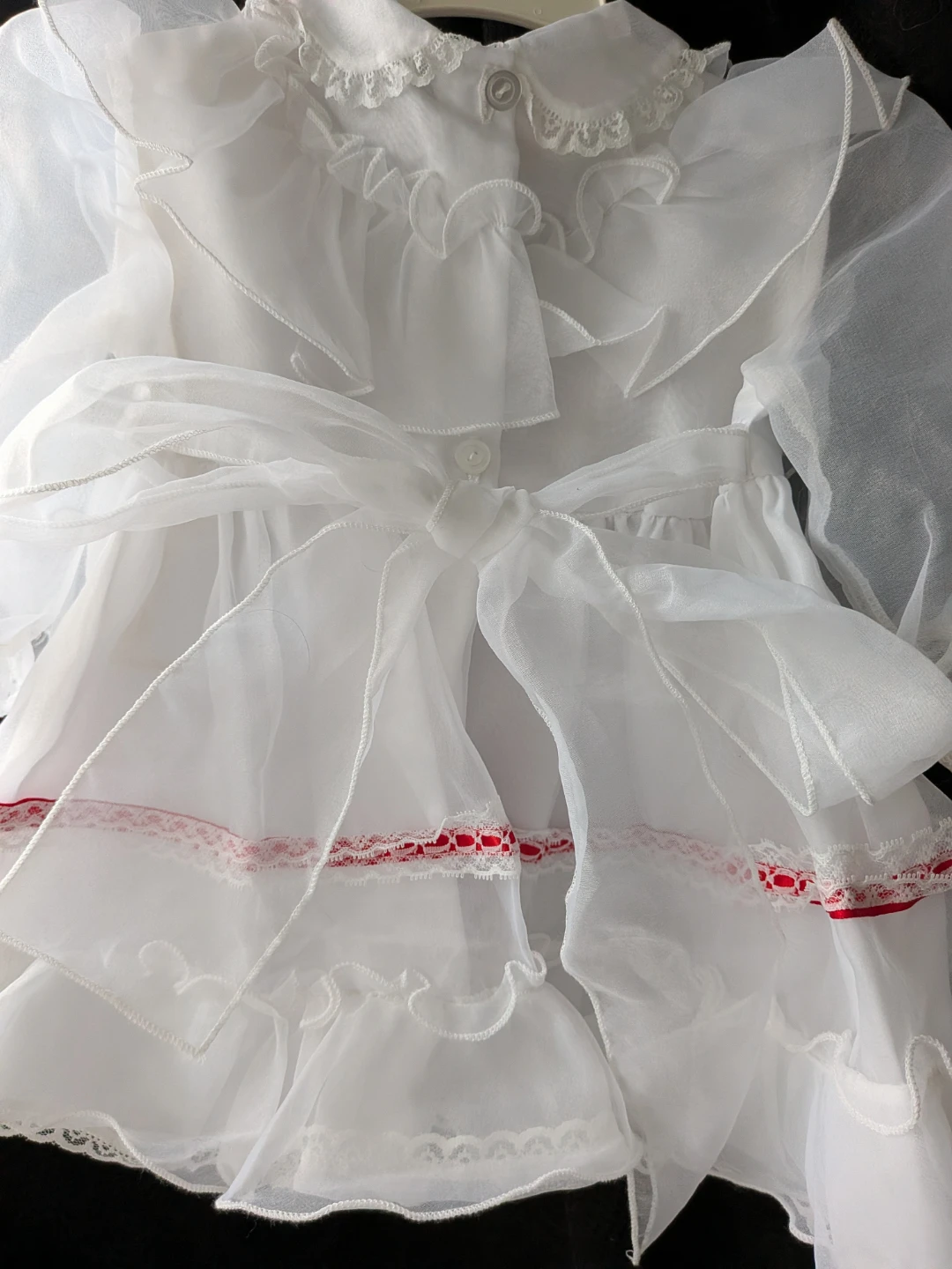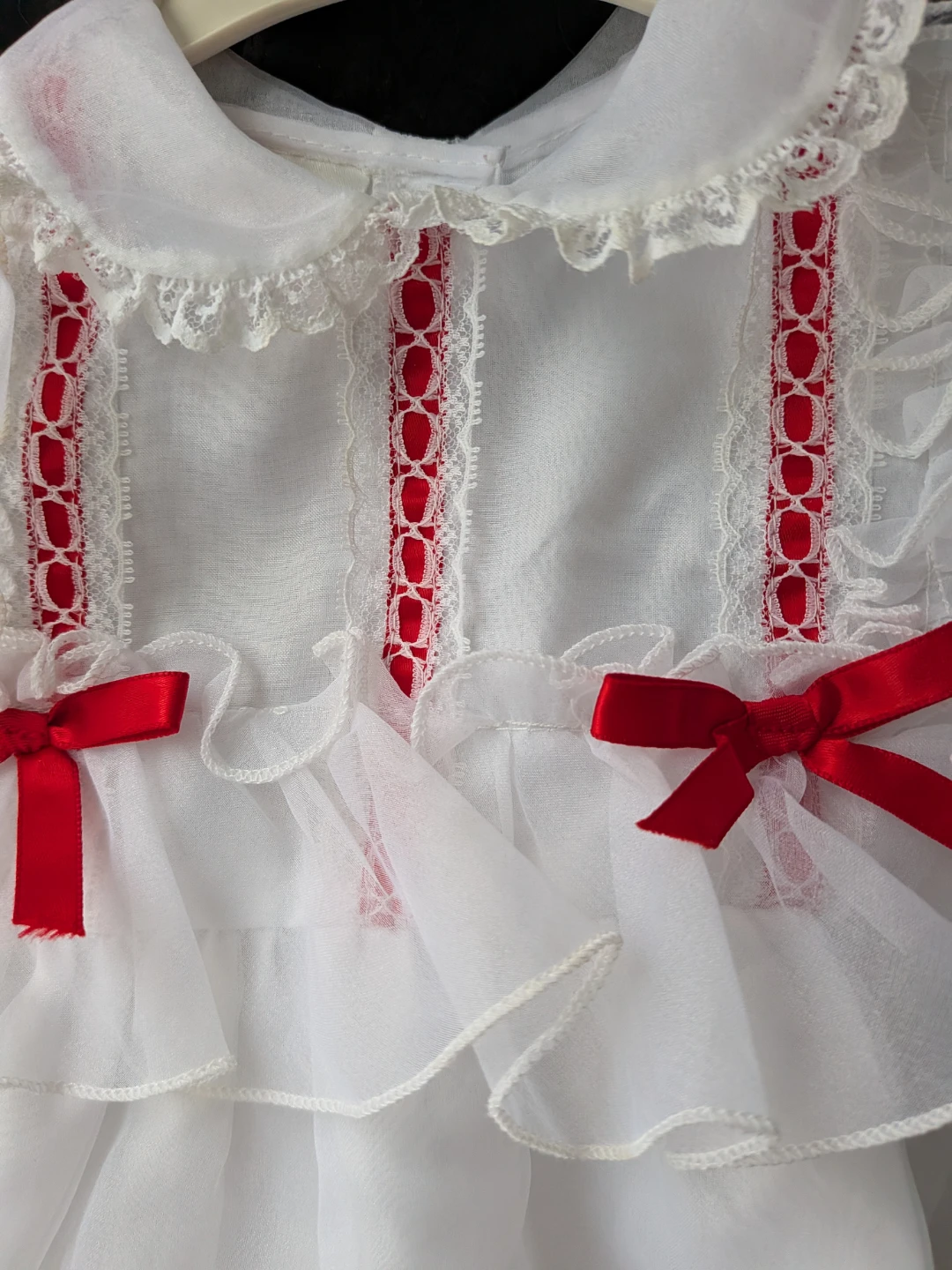 A cute vintage baby white dress from the 70's - 70's era featuring red bow accents! It's in great condition and perfect for a special occasion or just a fun day out. The dress has a layered, ruffled design with sheer fabric and delicate lace detailing.