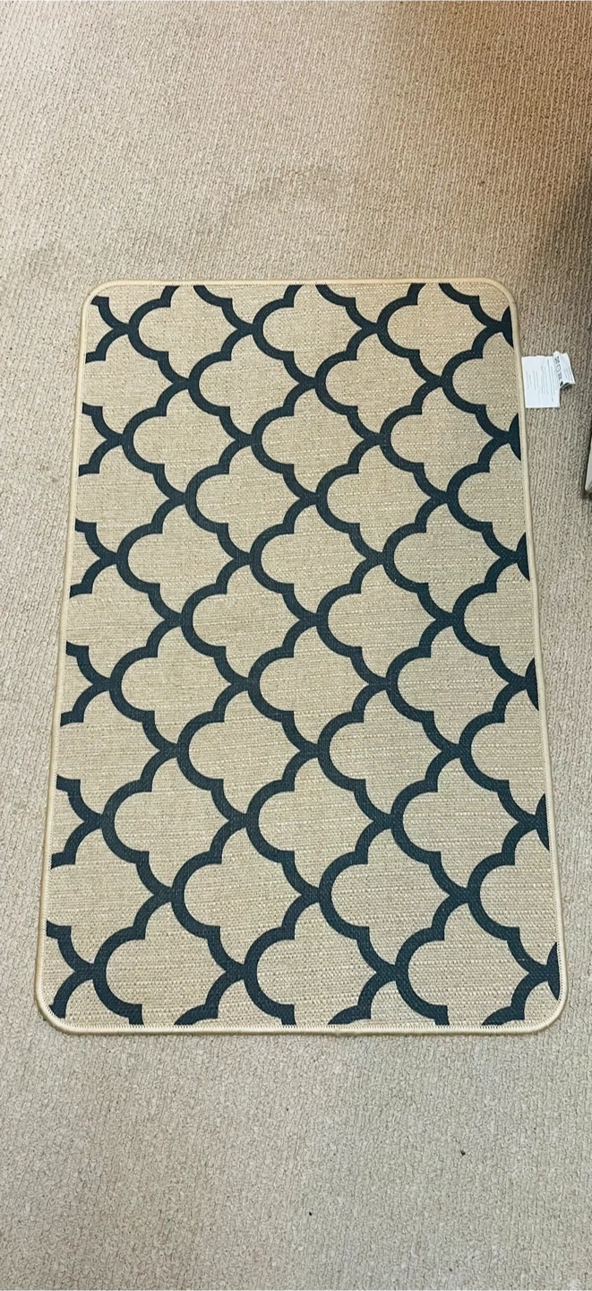 Set of three beige and black polyester mats with a modern trellis pattern. They’re great for winter weather because they protect your floors from snow, salt and moisture. All three are brand new and never used. Easy to clean and perfect for the kitchen, entryway or mudroom. 40$ for the set of 2 long and 1 small mats.