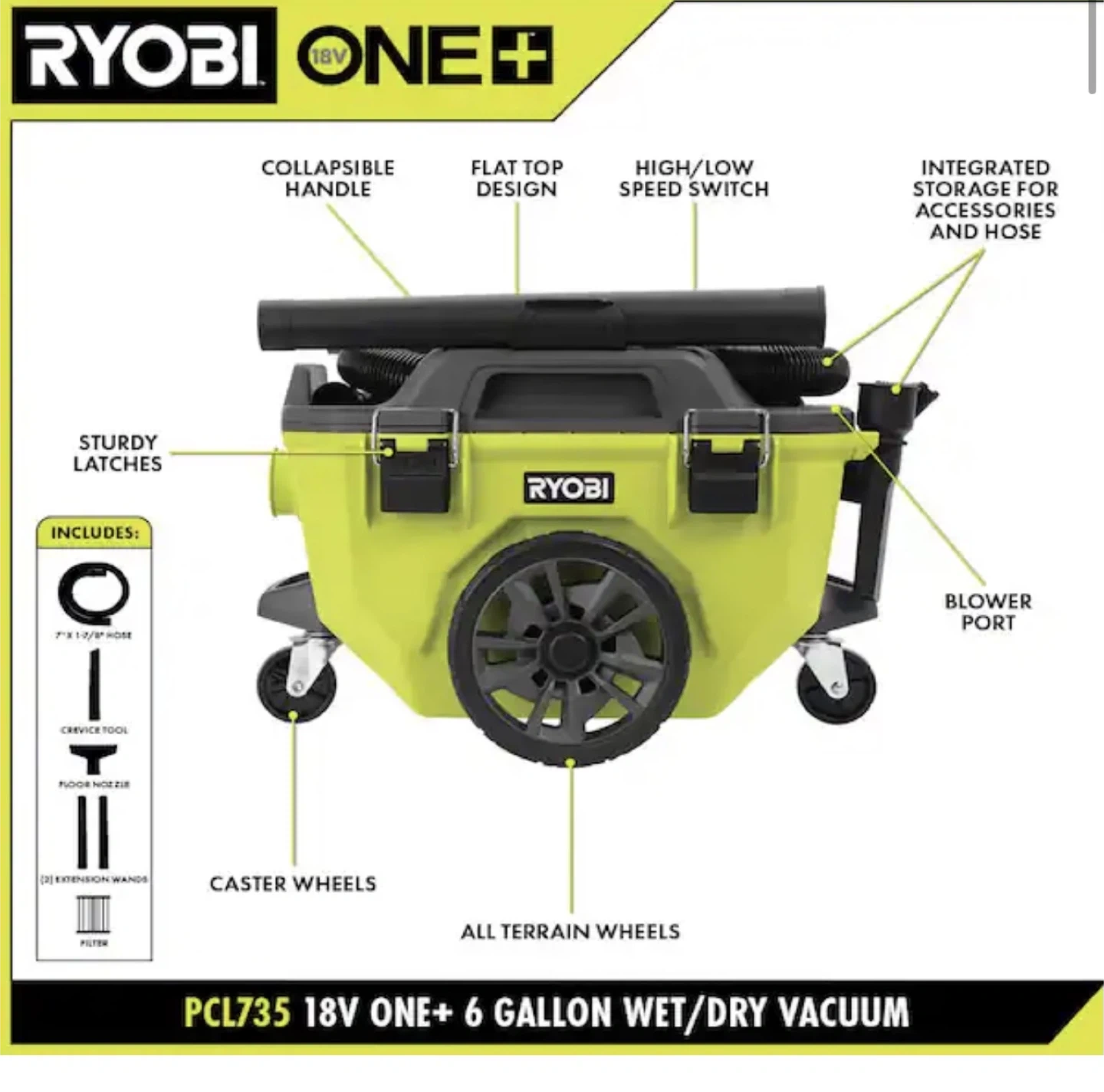This Ryobi ONE+ 18V wet/dry vacuum has a 6-gallon capacity. It includes a 7' x 1-7/8" hose, crevice tool, floor nozzle, (2) extension wands, and a large standard wet/dry vacuum filter. Features collapsible handle, flat top design, and all-terrain caster wheels. (TOOL ONLY)