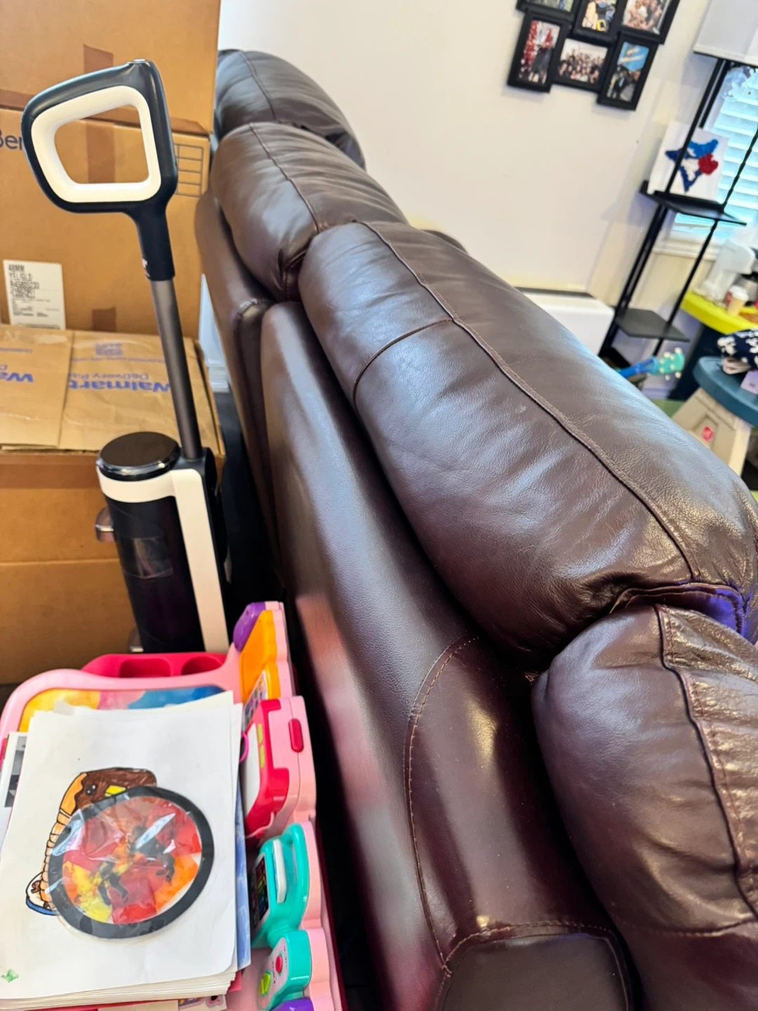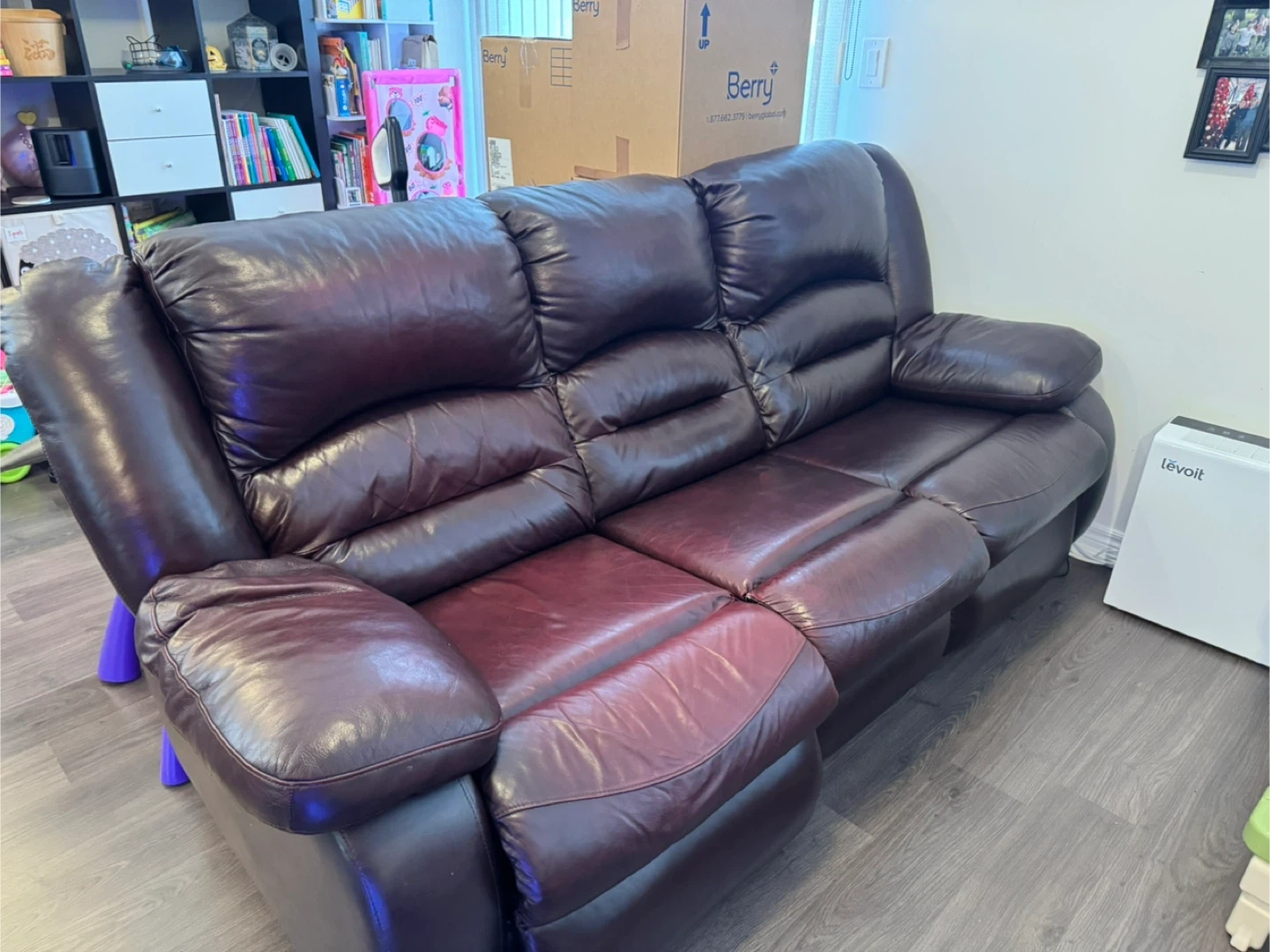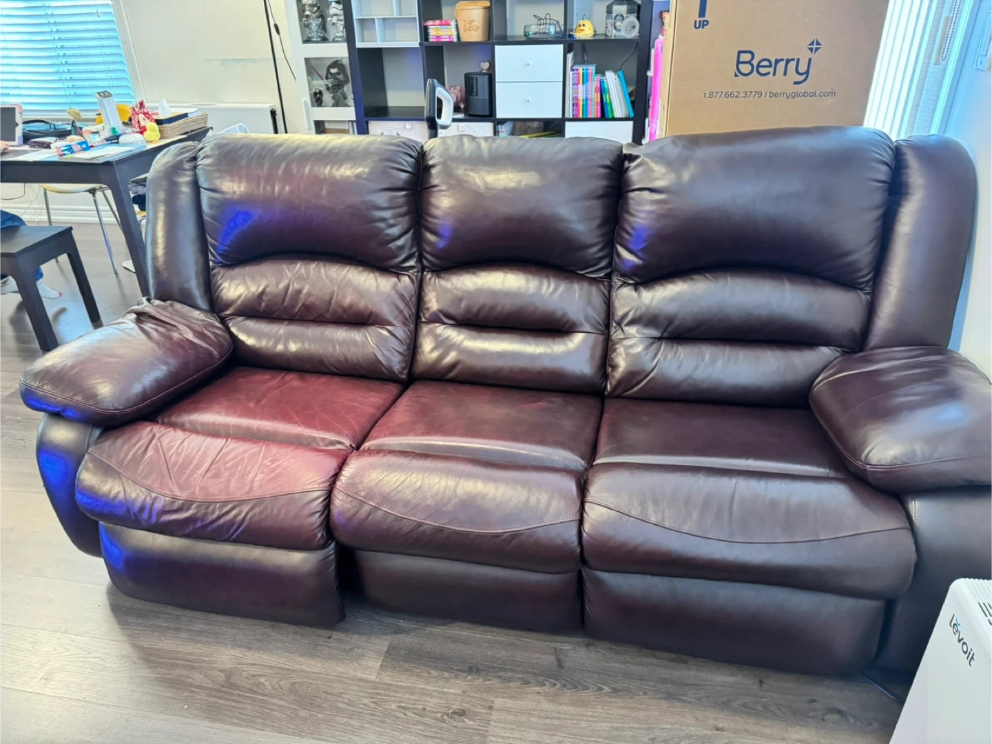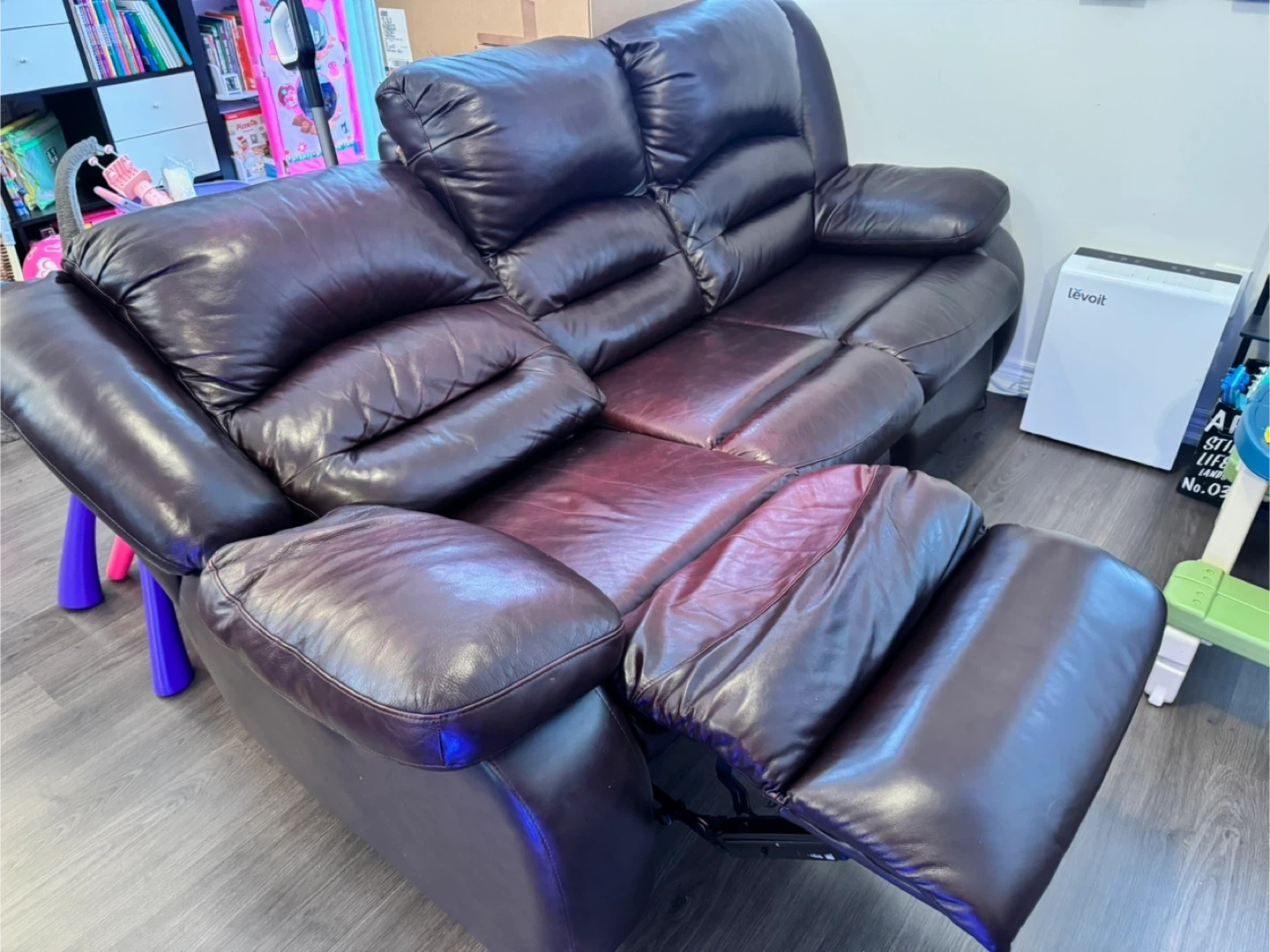 This is a brown leather three-seater reclining sofa. It's made of genuine leather and features padded armrests and headrests. The middle seat doesn't recline, but the two end seats do. It's comfortable for lounging!
