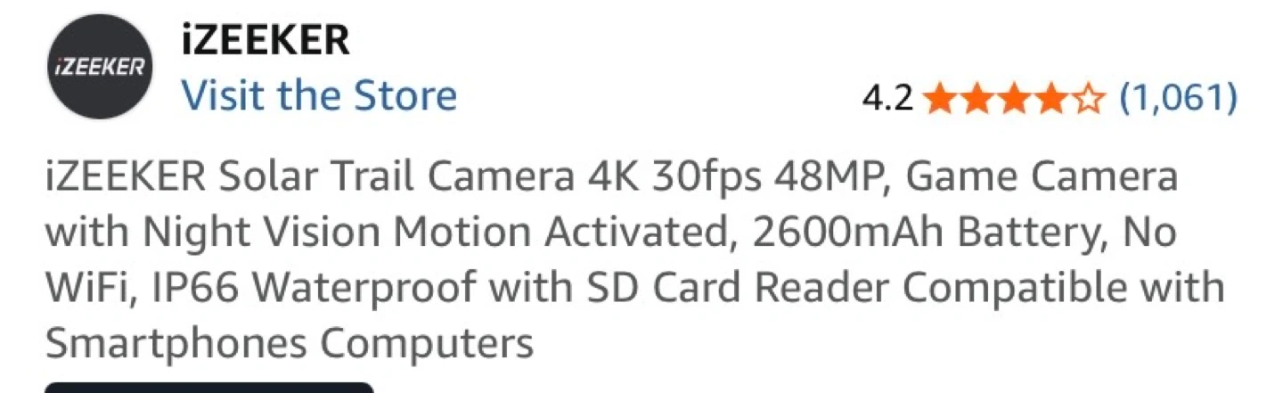 Selling an iZEEKER Solar Trail Camera. It's a game camera with night vision motion activation. It has a 2600mAh battery and is IP66 waterproof. It also has an SD card reader and is compatible with smartphones and computers