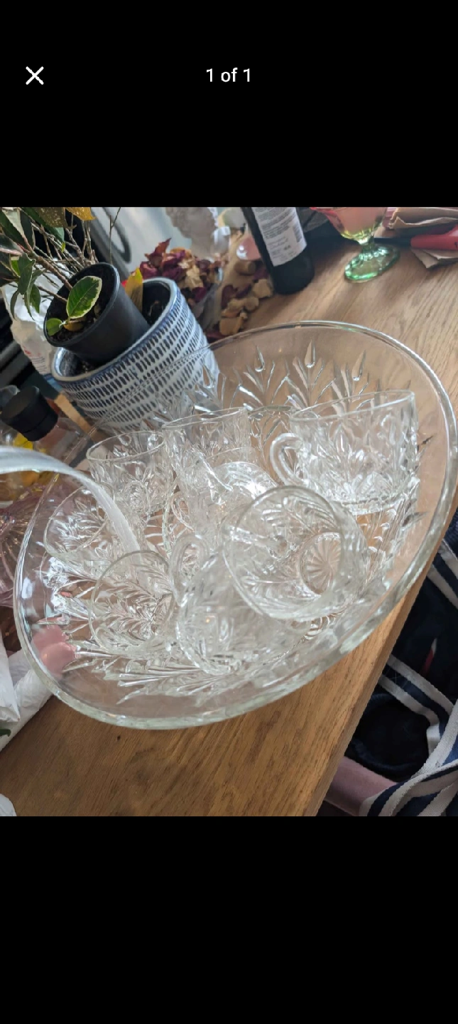 Selling a beautiful crystal punch bowl set! It comes with the bowl, a ladle, and several matching cups. Perfect for parties or special occasions. The set features a lovely floral design.