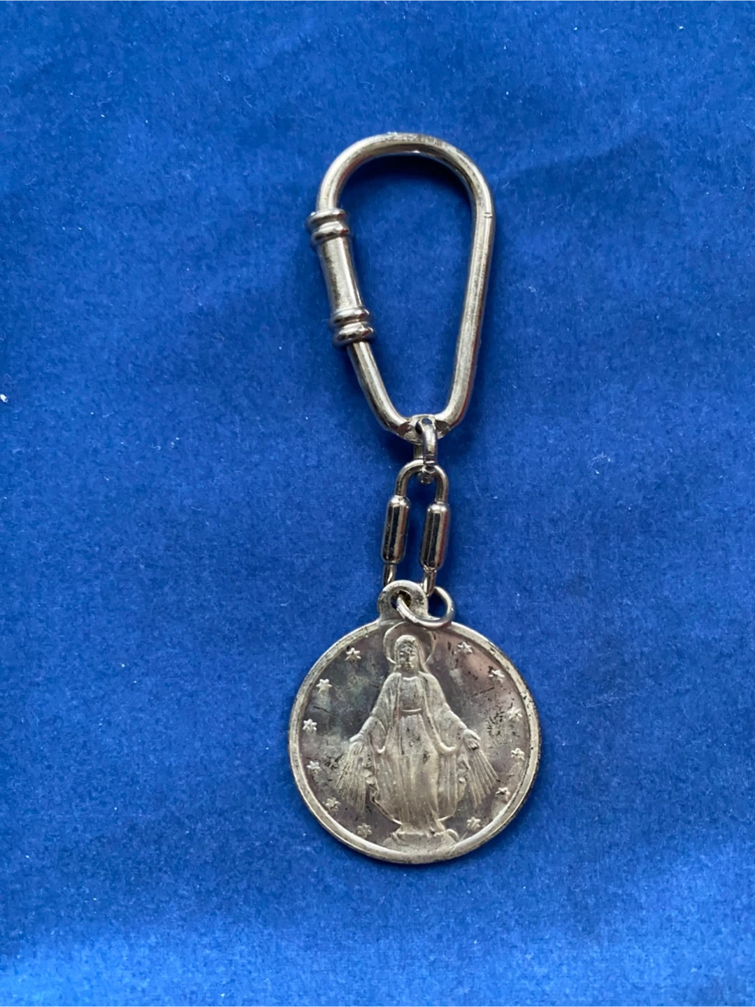 This coin on a keychain features a medallion with Pope John Paul II on one side and the Virgin Mary on the other. It's made of metal and includes a sturdy clip. A nice keepsake or devotional item.