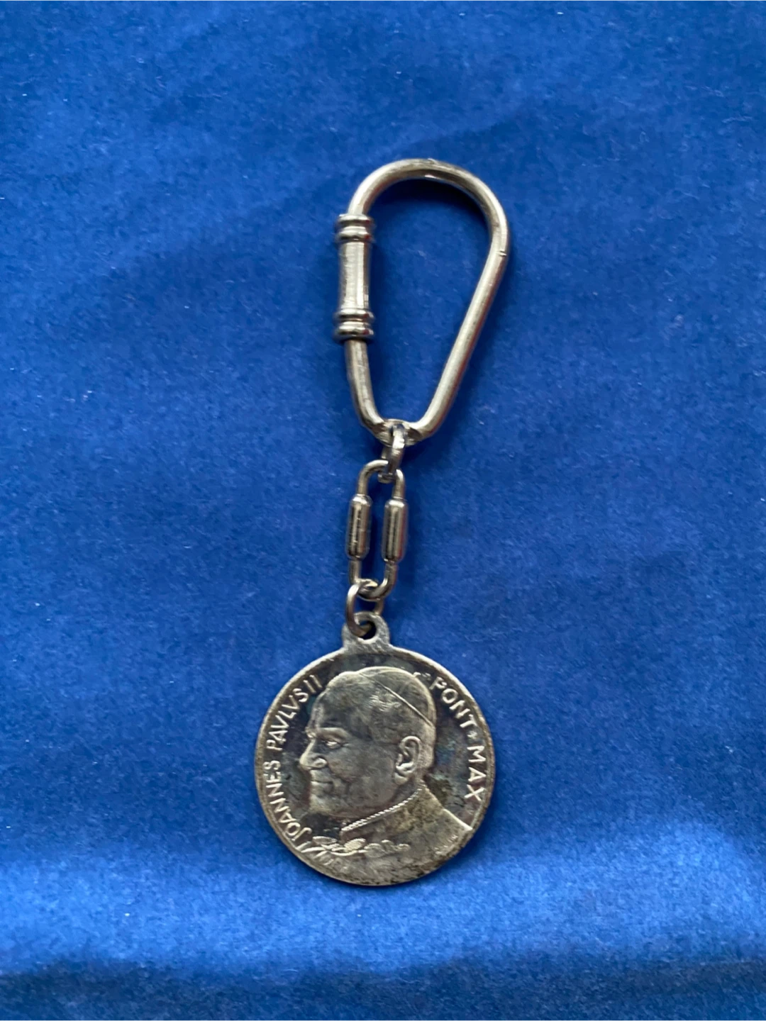 This coin on a keychain features a medallion with Pope John Paul II on one side and the Virgin Mary on the other. It's made of metal and includes a sturdy clip. A nice keepsake or devotional item.