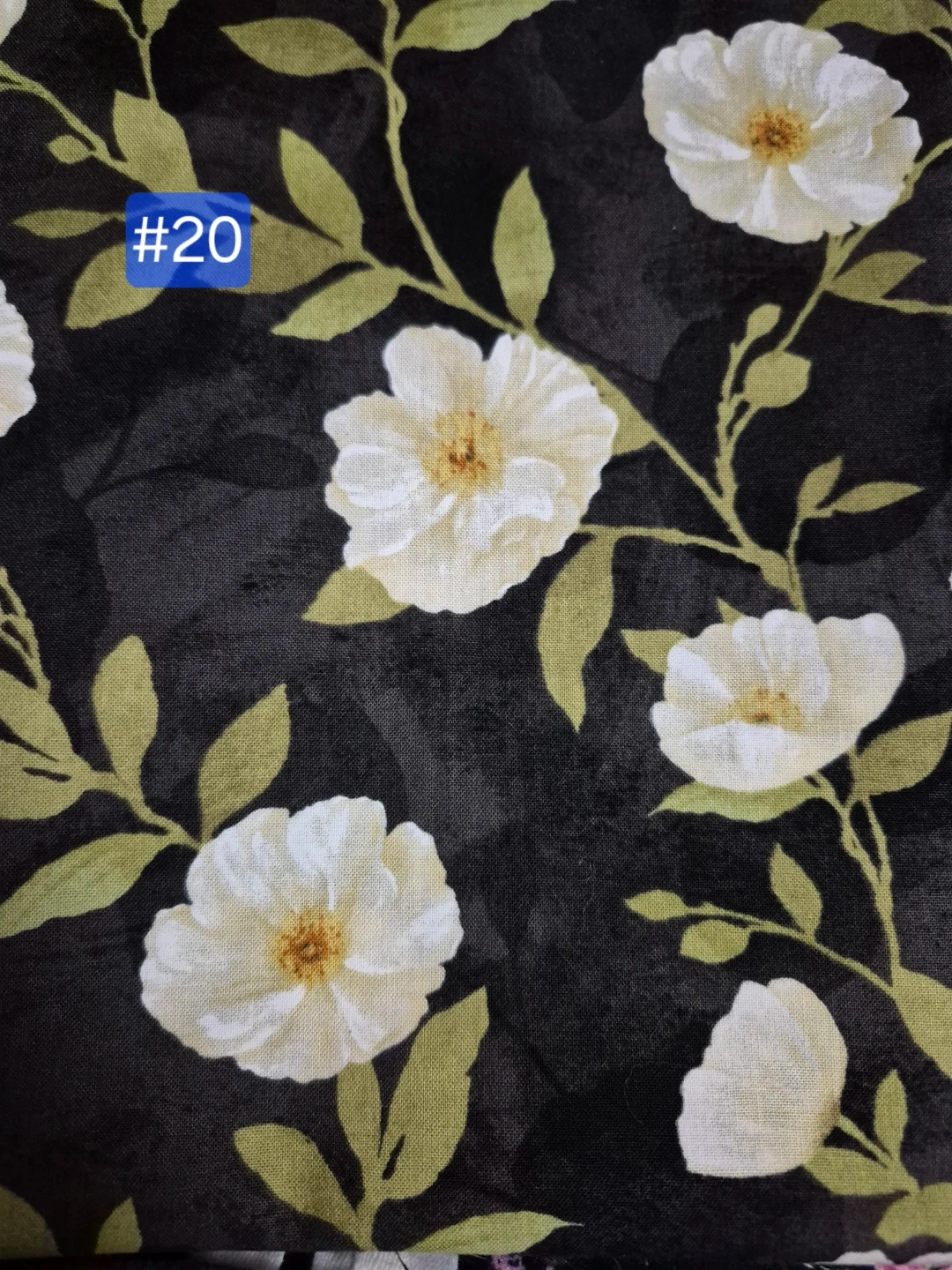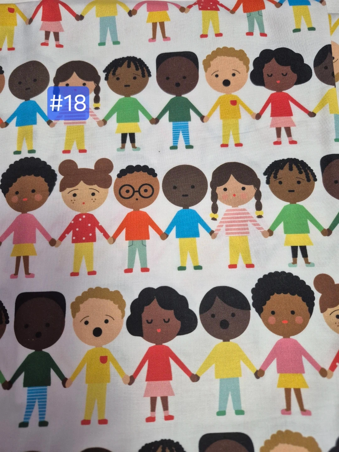 A collection of assorted fabric prints including floral, mannequins, and animal designs. Great for crafting and sewing projects!