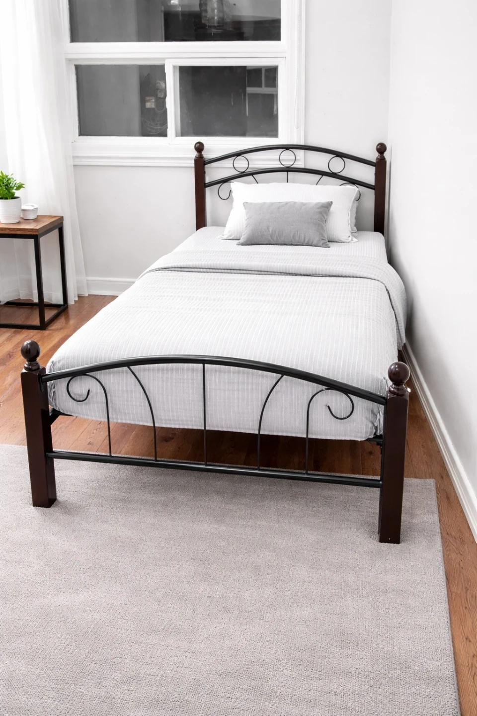 This twin bed frame features a black metal headboard and footboard with decorative scrollwork. It has sturdy wooden posts at the corners. It's a classic design that's sure to complement most bedroom decor. The frame supports a twin mattress.