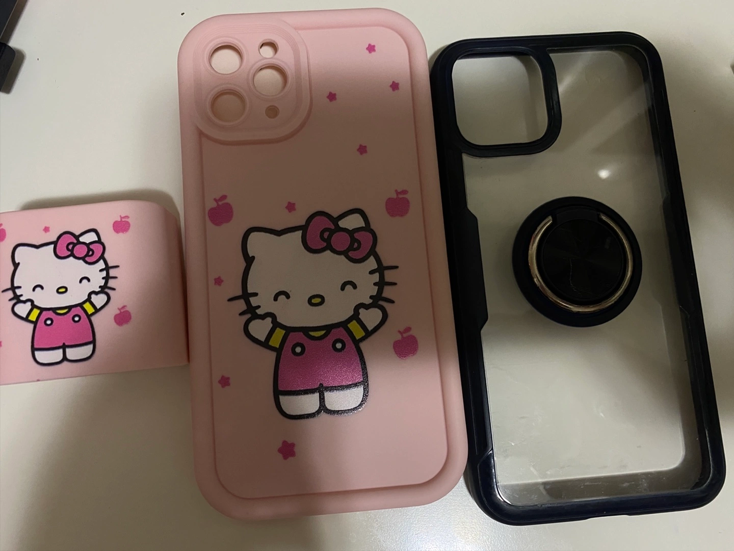 A set of phone cases, featuring new Hello Kitty. One pink case is decorated with the character and a navy blue case. These cases can help protect your phone in an enjoyable manner.