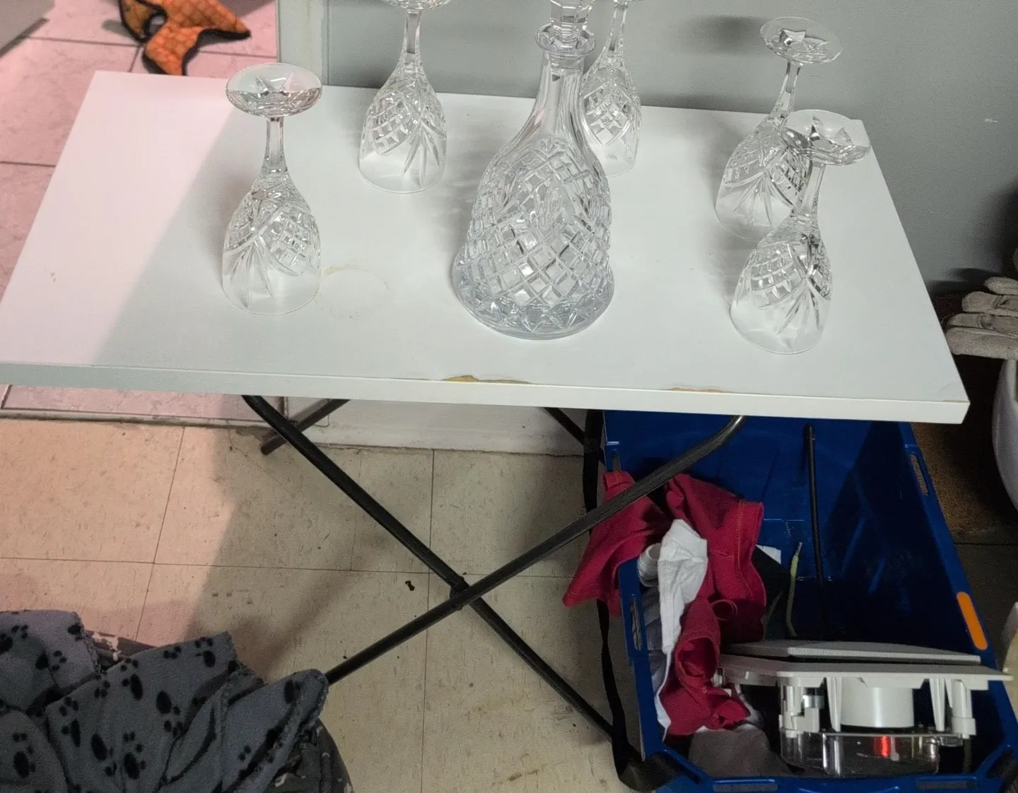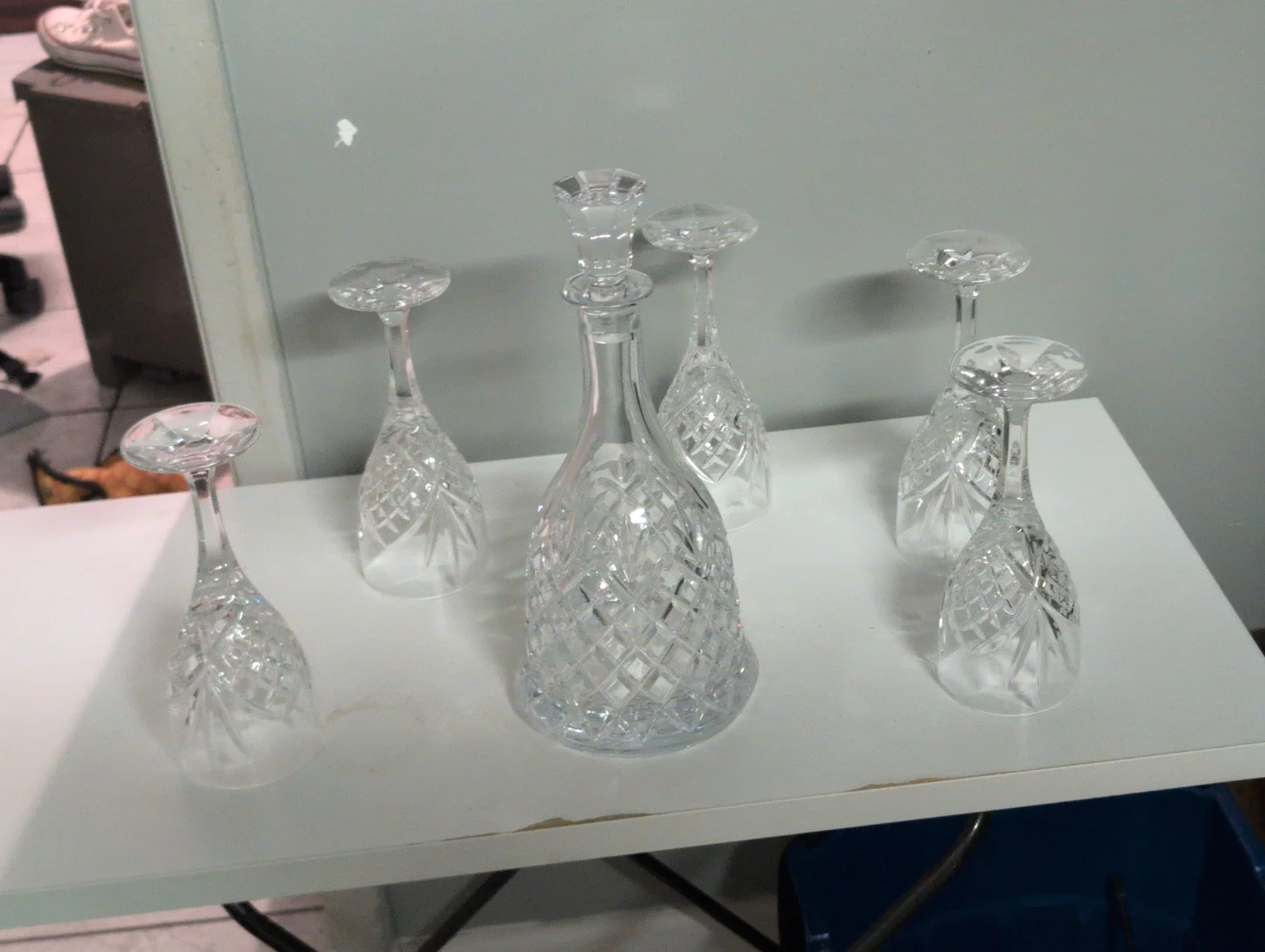 Crystal glass decanter with a stopper and six wine glasses. Intricate diamond cut pattern on all pieces. Perfect for serving drinks during special occasions.