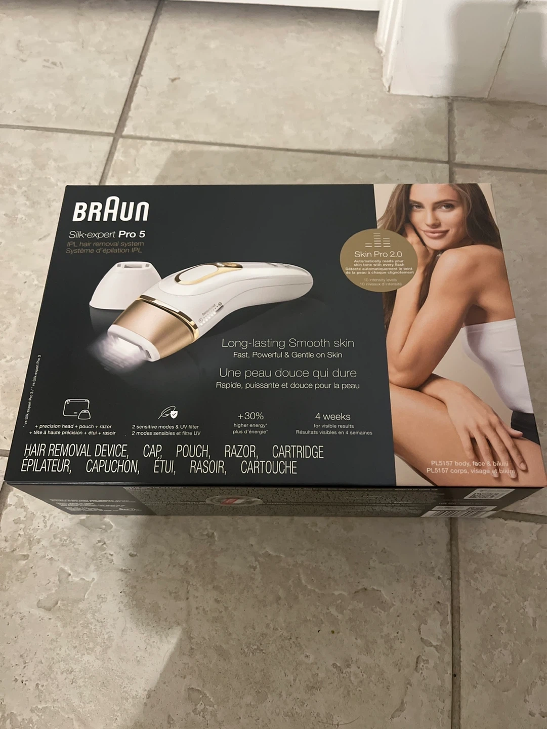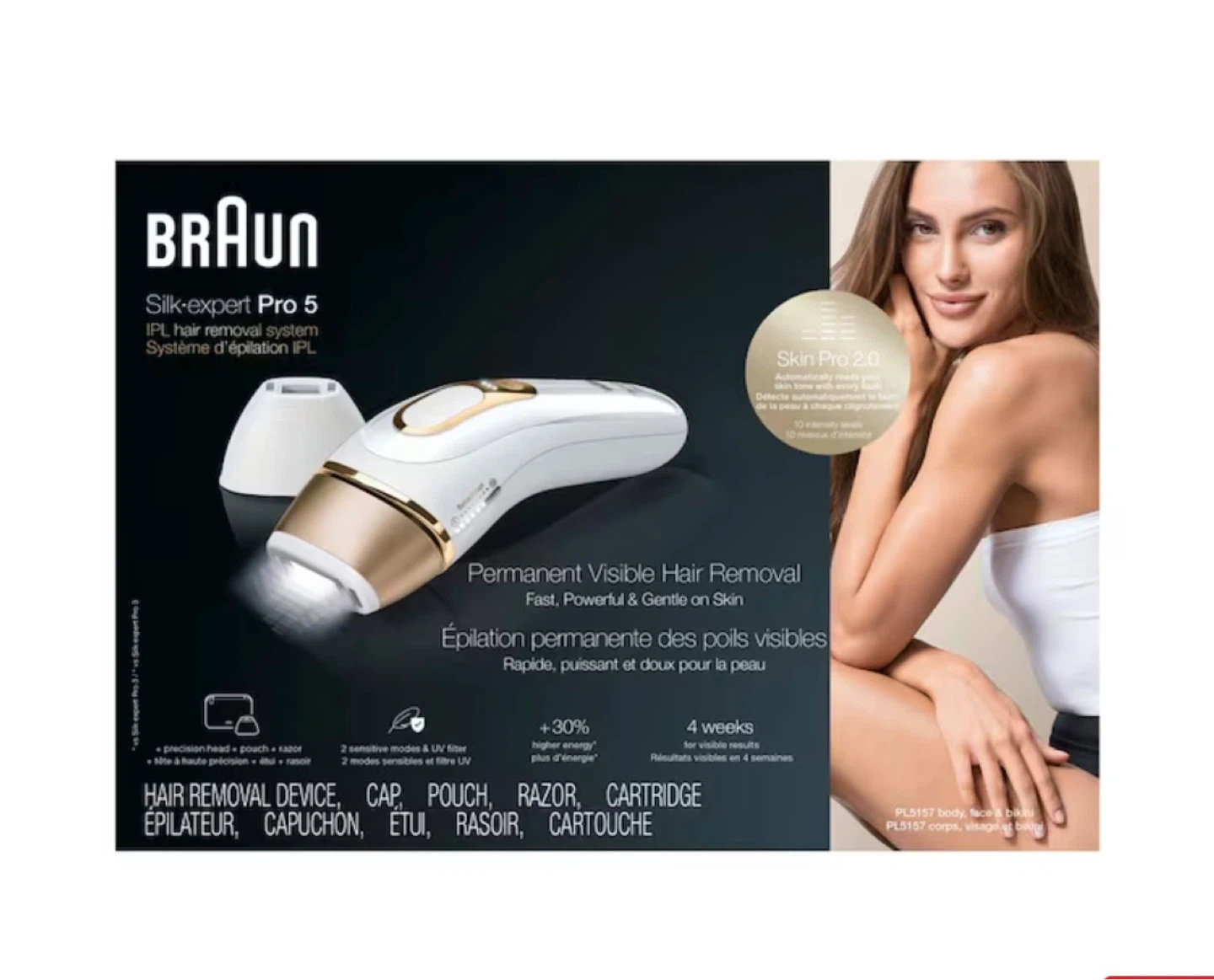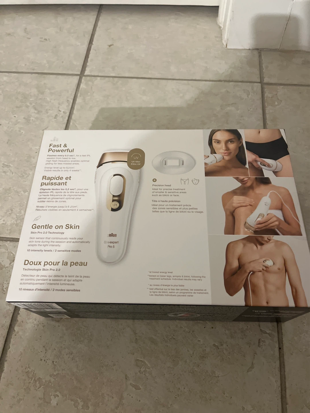 This is the Braun Silk-expert Pro 5 IPL hair removal system. It features Skin Pro 2.0 technology for automatic skin tone detection. It offers permanent visible hair removal with results in 4 weeks.