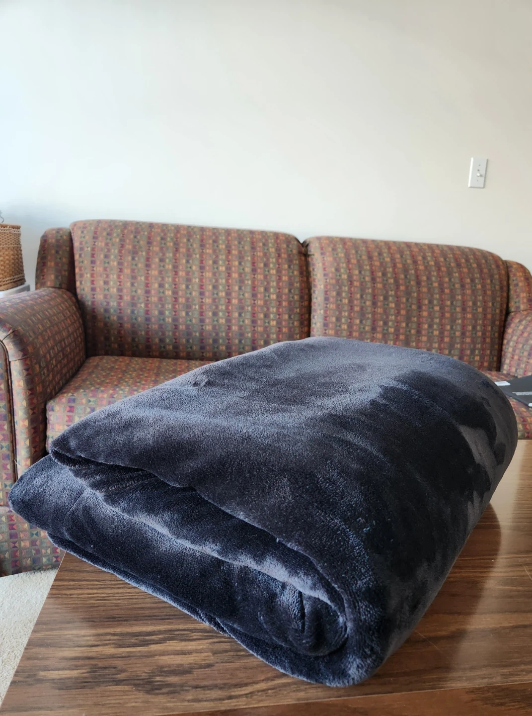 Soft and warm with a fluffy texture on one side and smooth fleece on the other. Great for staying warm on chilly nights!