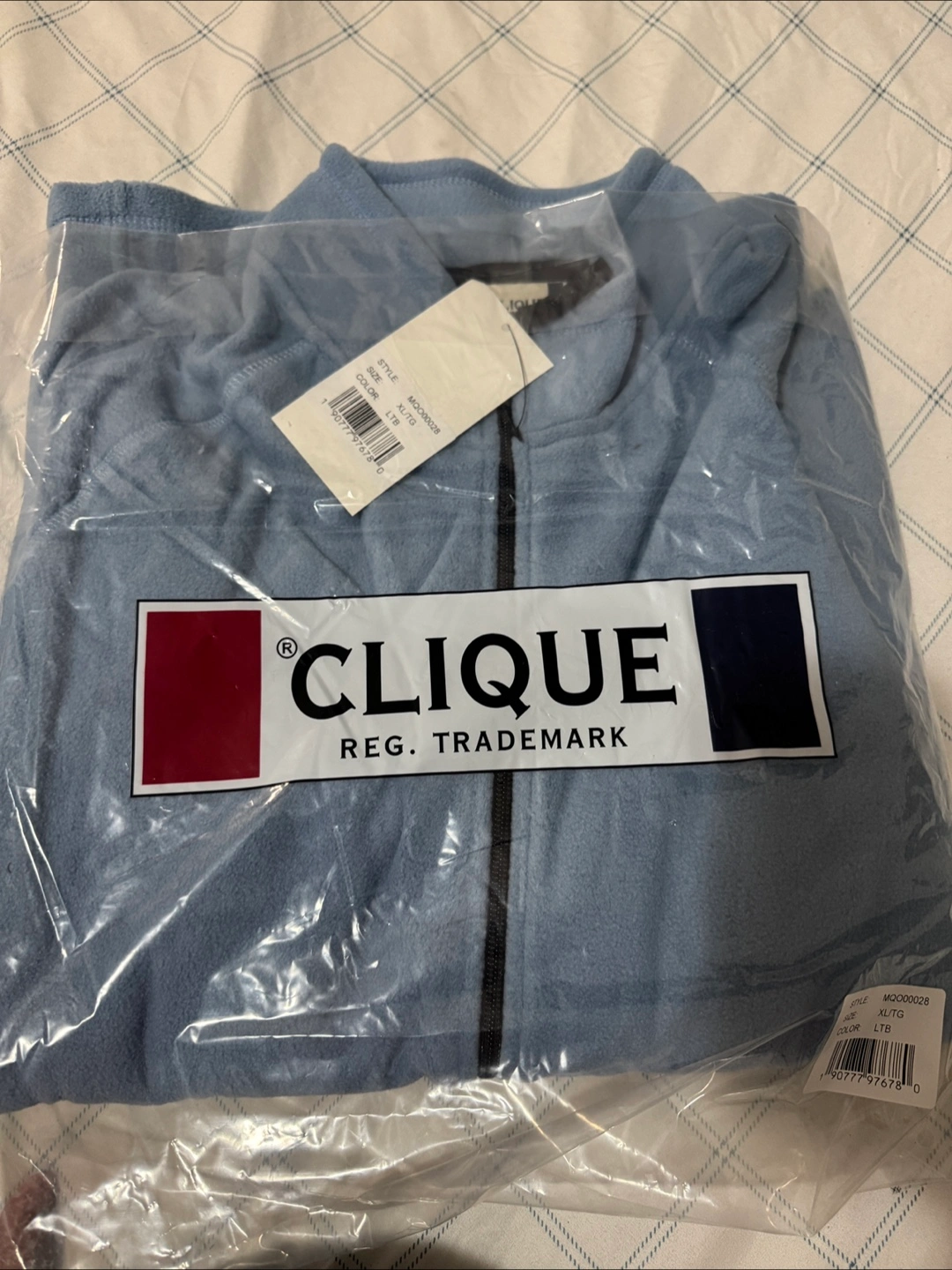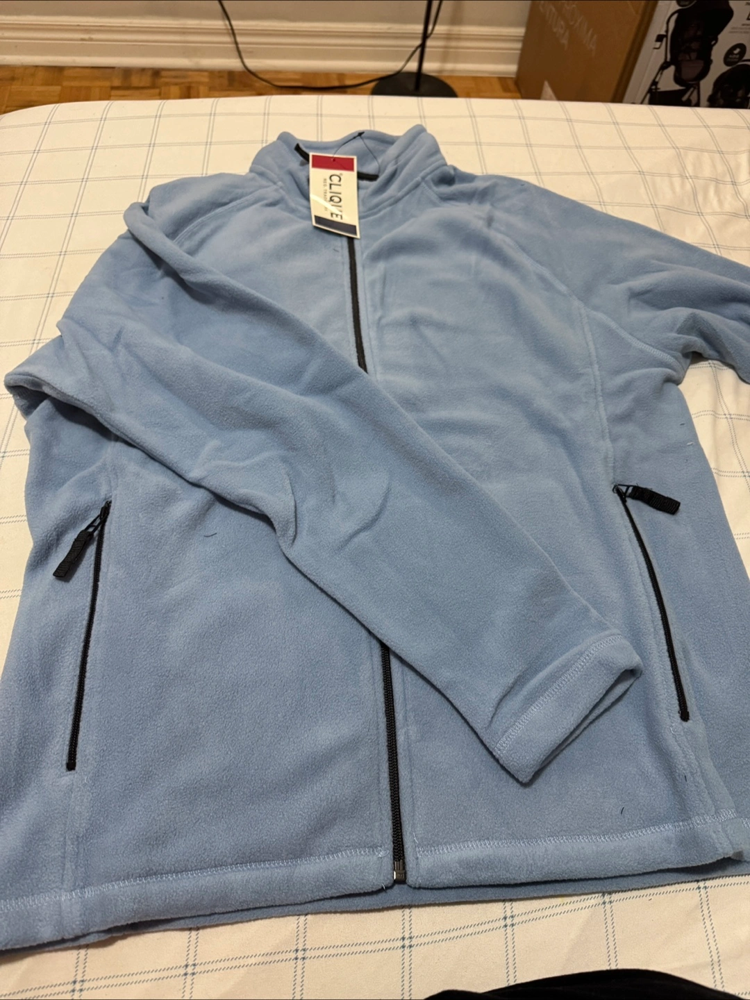 Light blue Clique fleece jacket. Size L/G. Features a full-zip front and zippered pockets. Pickup in Wellesley street east