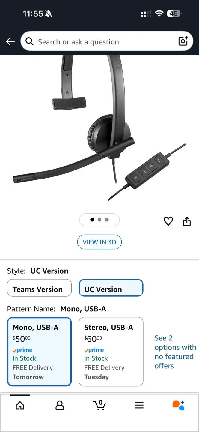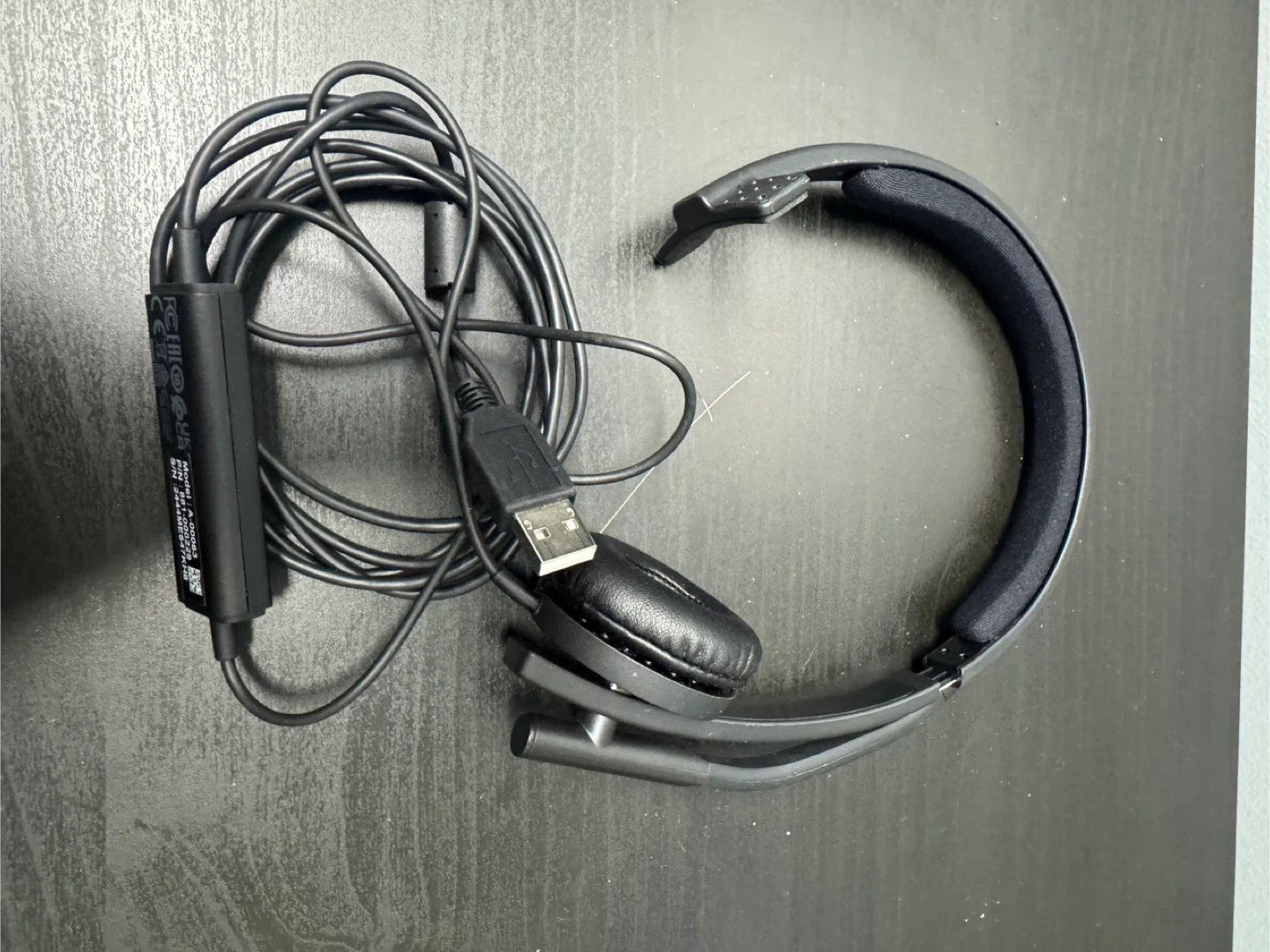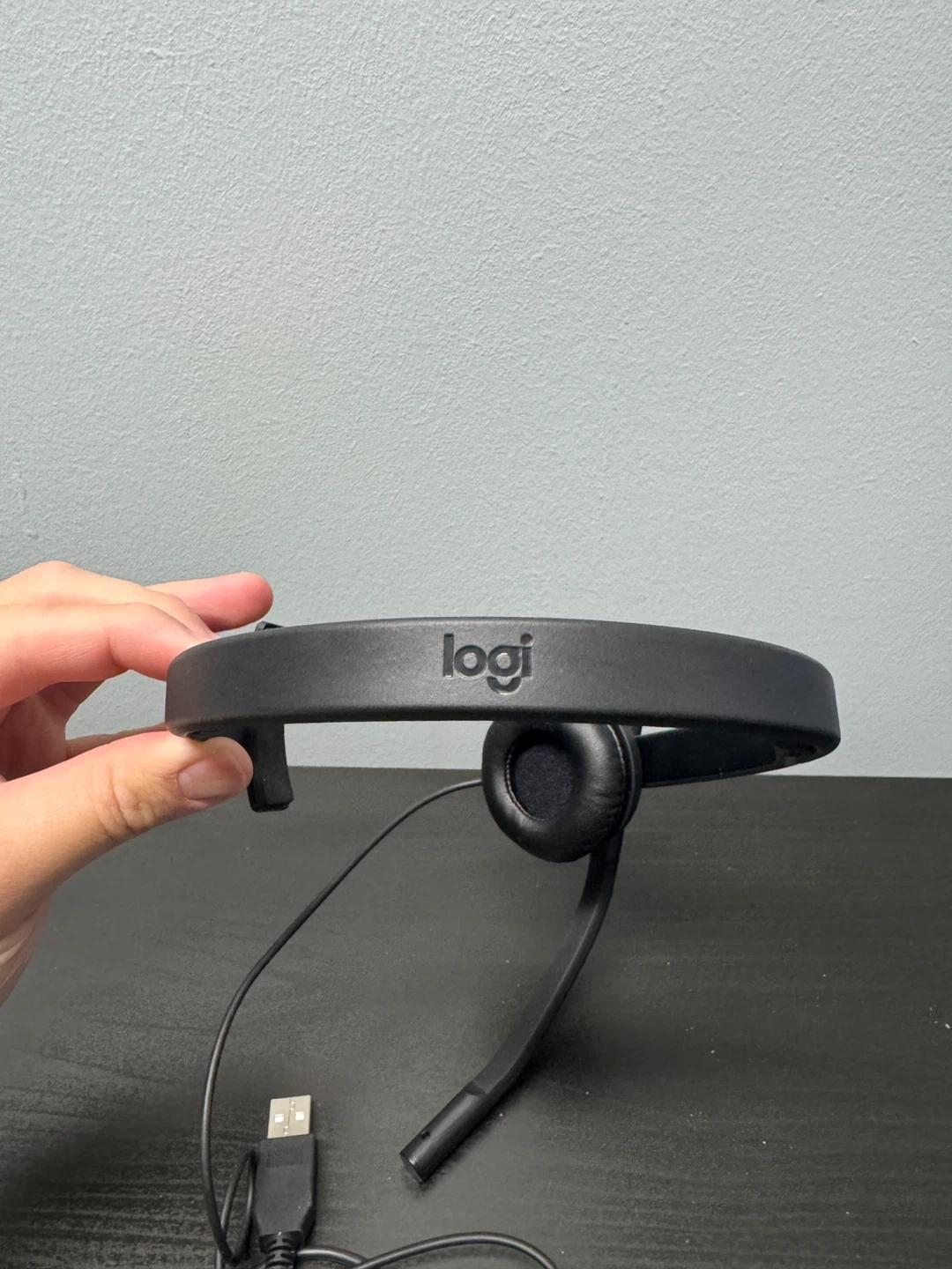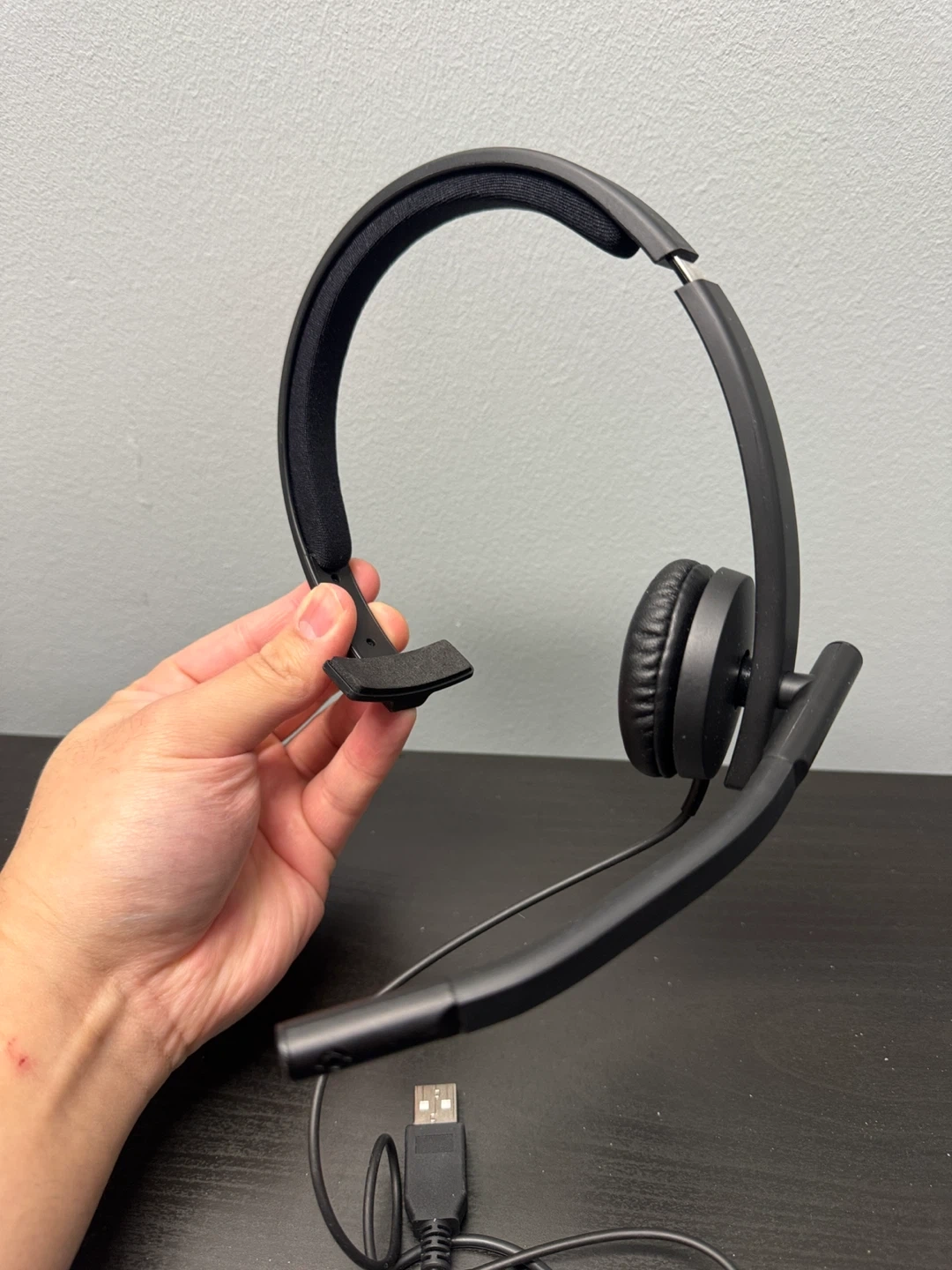 Logitech H570e mono USB headset with microphone. It has a USB-A connector and inline controls. Great for online meetings and calls!