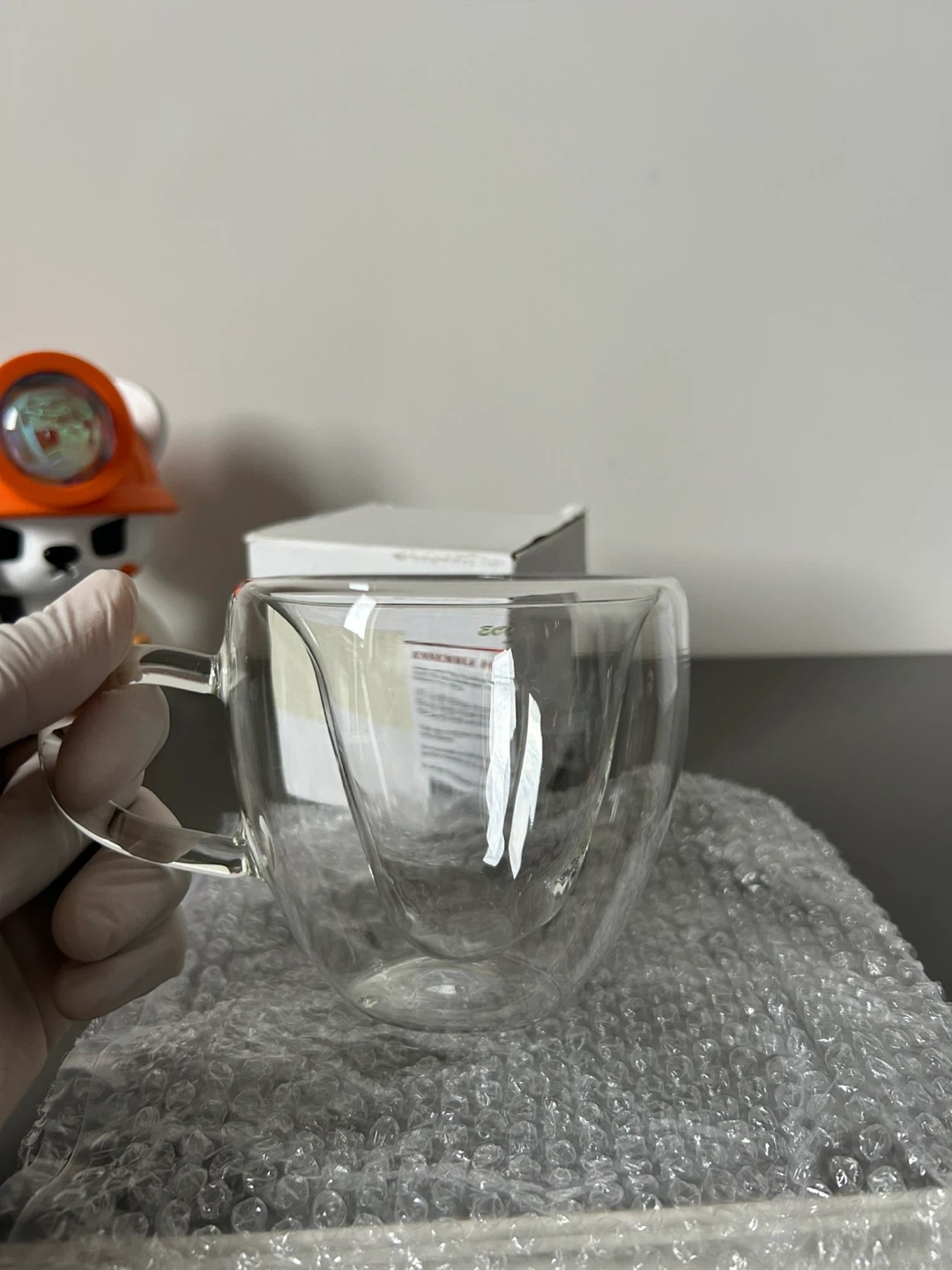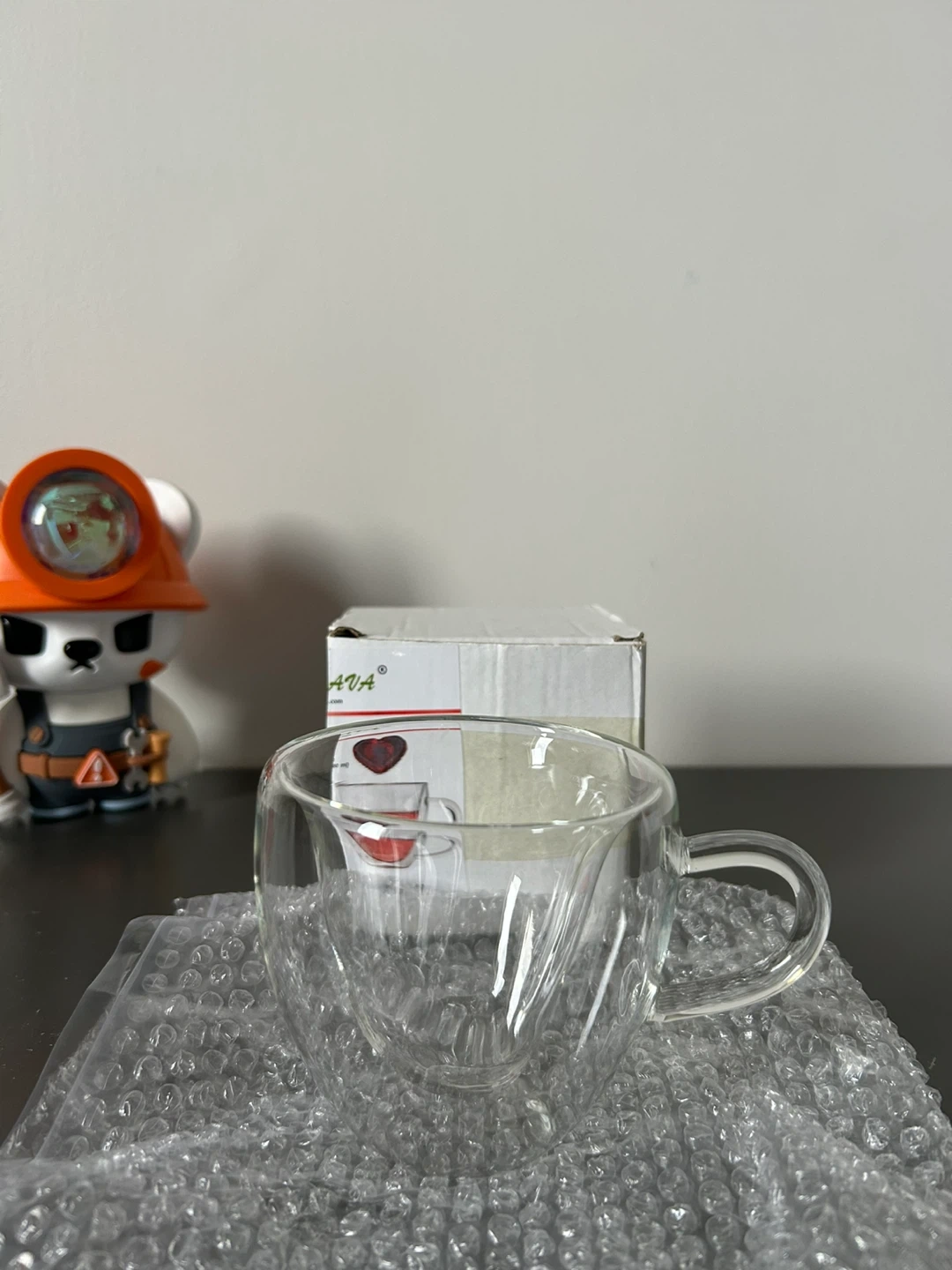 This is a double-wall glass coffee mug with a heart shape inside. It's designed to keep drinks hot or cold. Perfect for enjoying your favourite hot beverages!