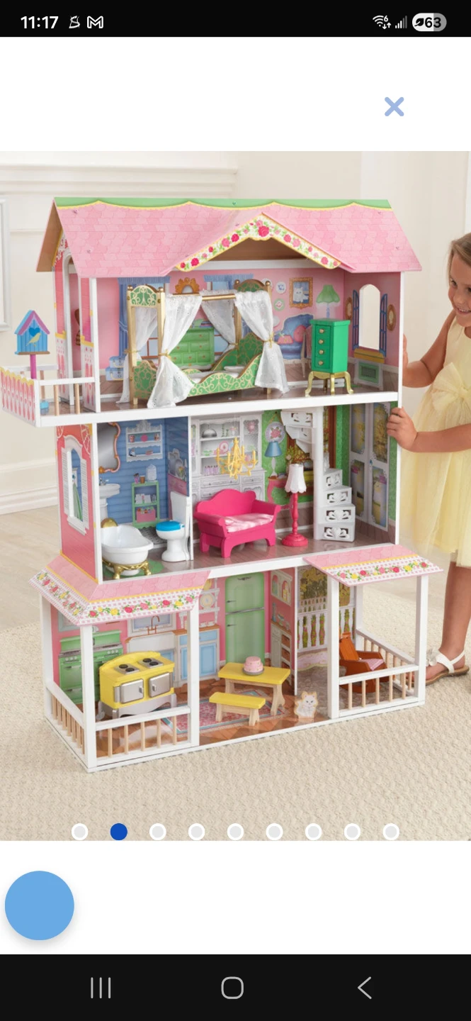 This is a dollhouse with multiple levels. It includes miniature furniture (missing few pieces) and accessories for play. The vibrant colours and detailed design make it a delightful playset for kids.