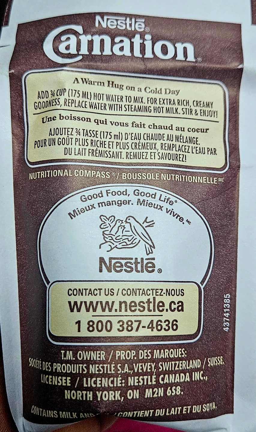 A brand new ceramic mug in a box. Plus, enjoy a warm hug on a cold day with Nestle Carnation hot chocolate mix! Just add 3/4 cup (175 ml) of hot water to mix for an extra rich, creamy goodness. It contains milk and soy. Remuez et savourez!