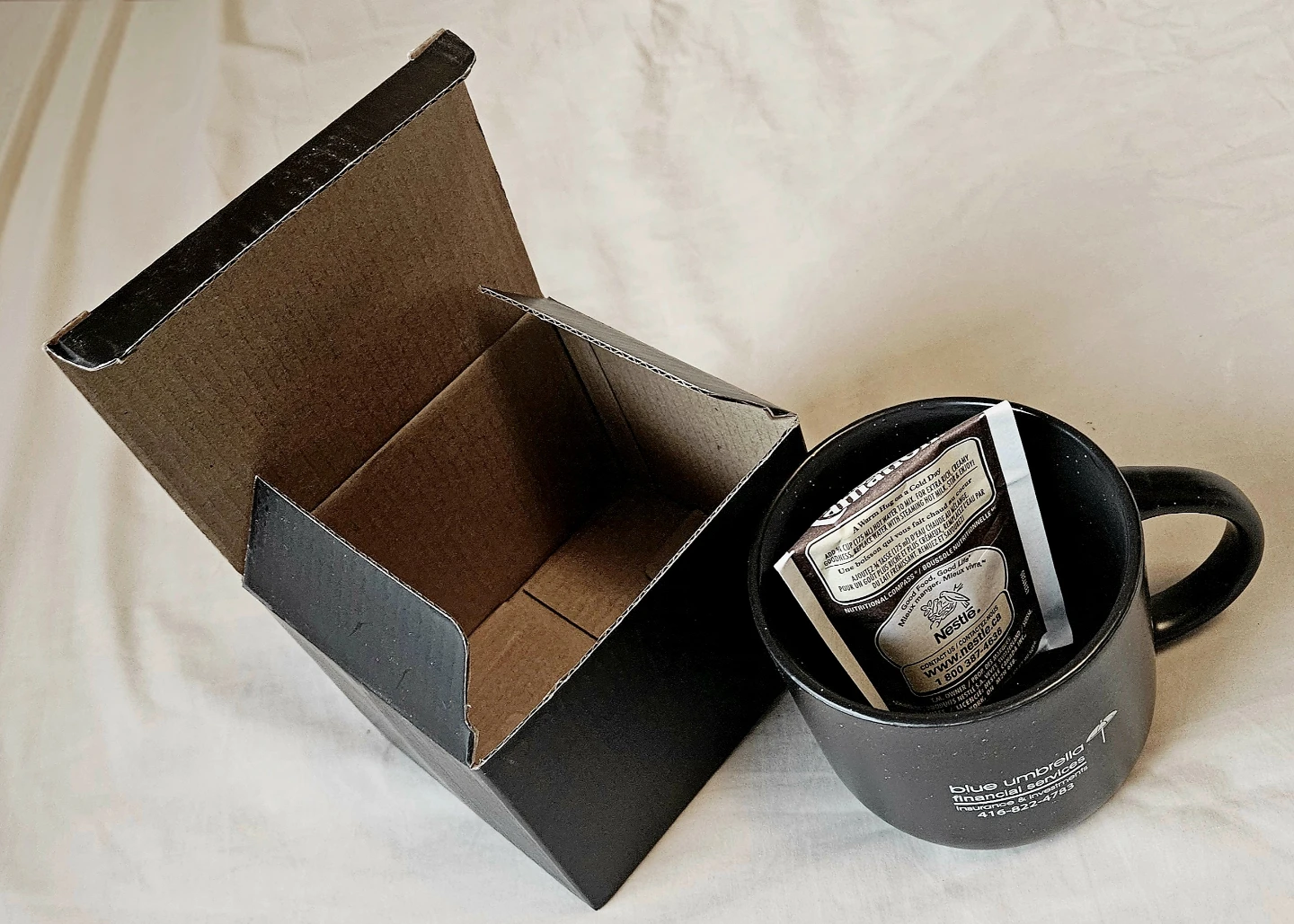 A brand new ceramic mug in a box. Plus, enjoy a warm hug on a cold day with Nestle Carnation hot chocolate mix! Just add 3/4 cup (175 ml) of hot water to mix for an extra rich, creamy goodness. It contains milk and soy. Remuez et savourez!