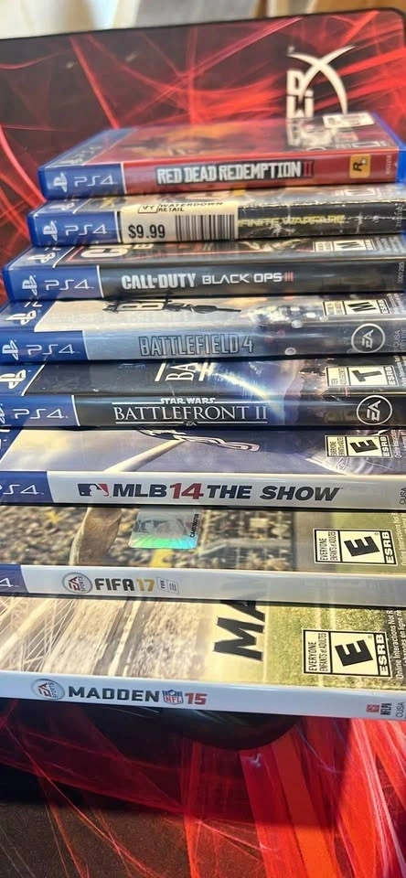Selling my PS4 games because I upgraded to a PS5. Adult owned, disks are in great shape. Games included: Grand Theft Auto V (not pictured), Red Dead Redemption 2, Call of Duty: WW2, Call of Duty: Black Ops 3, Call of Duty: Infinite Warfare, Battlefield 4, Star Wars: Battlefront 2, MLB 14, Madden 15, FIFA 17. Pickup in Dunnville.