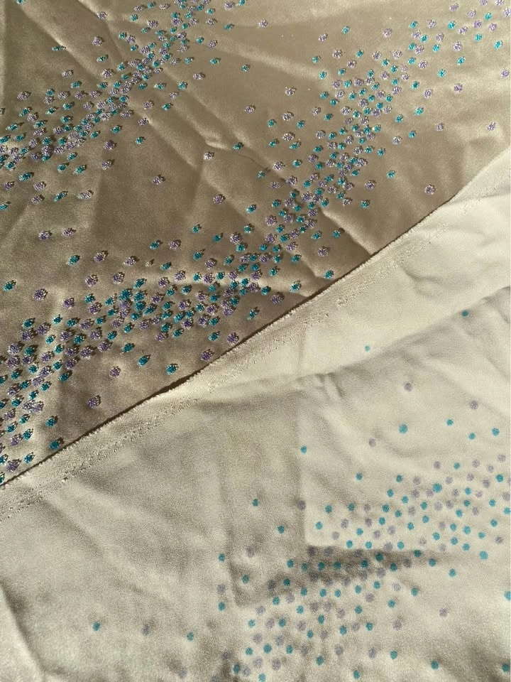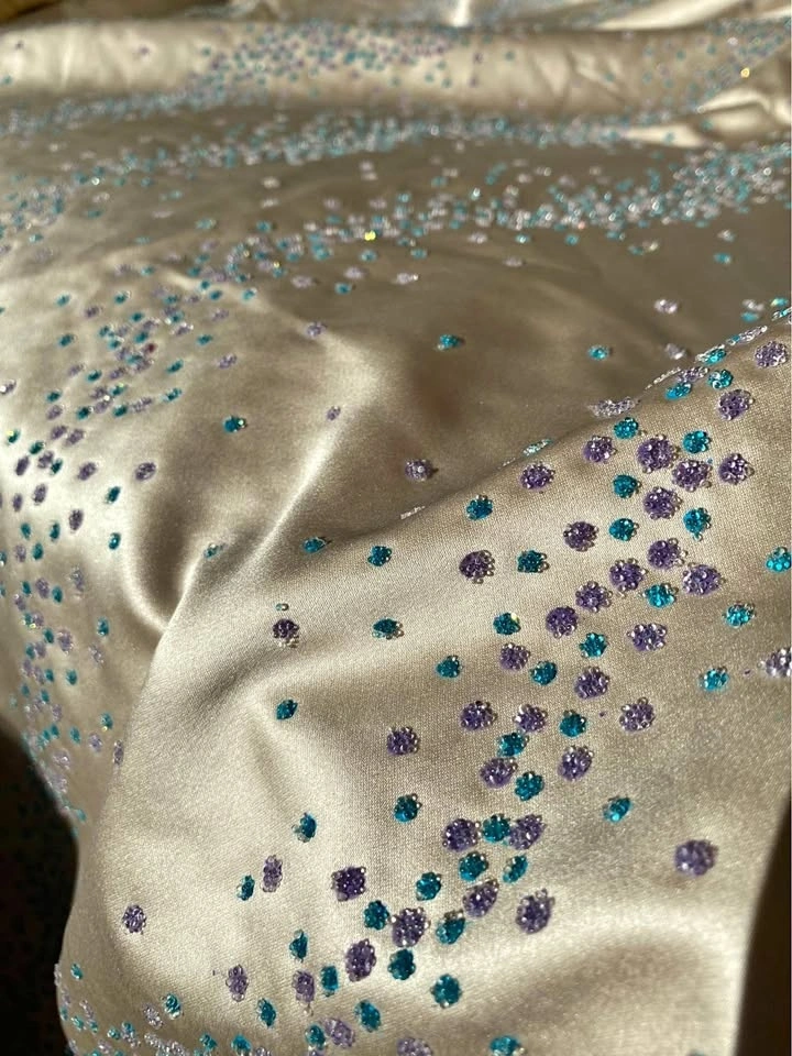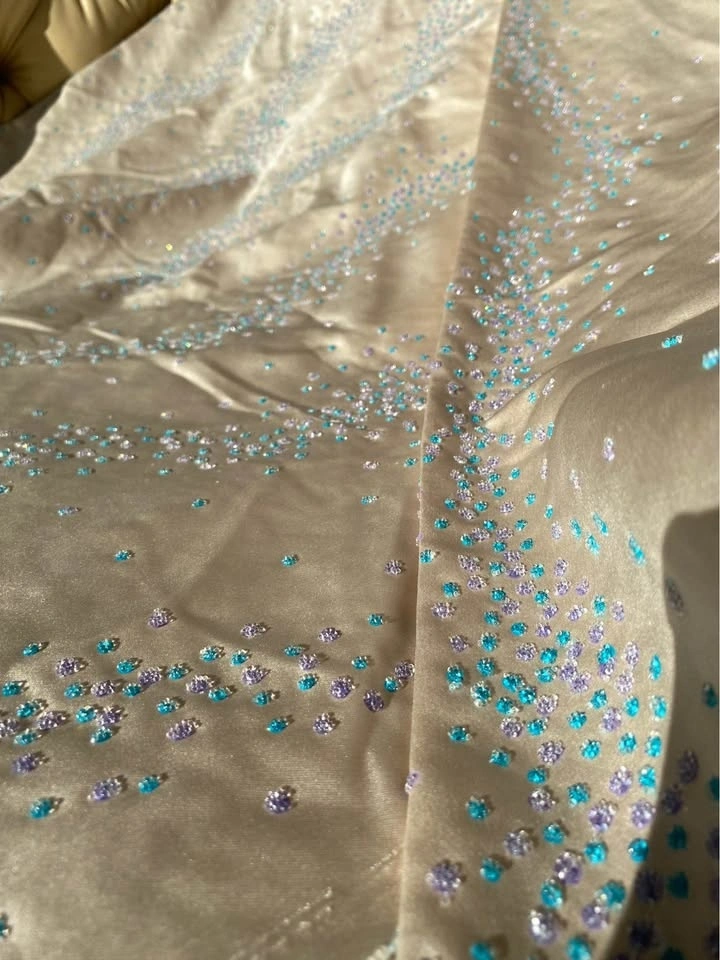 Beautiful cream polyester fabric embellished with blue and purple sparkly clusters.