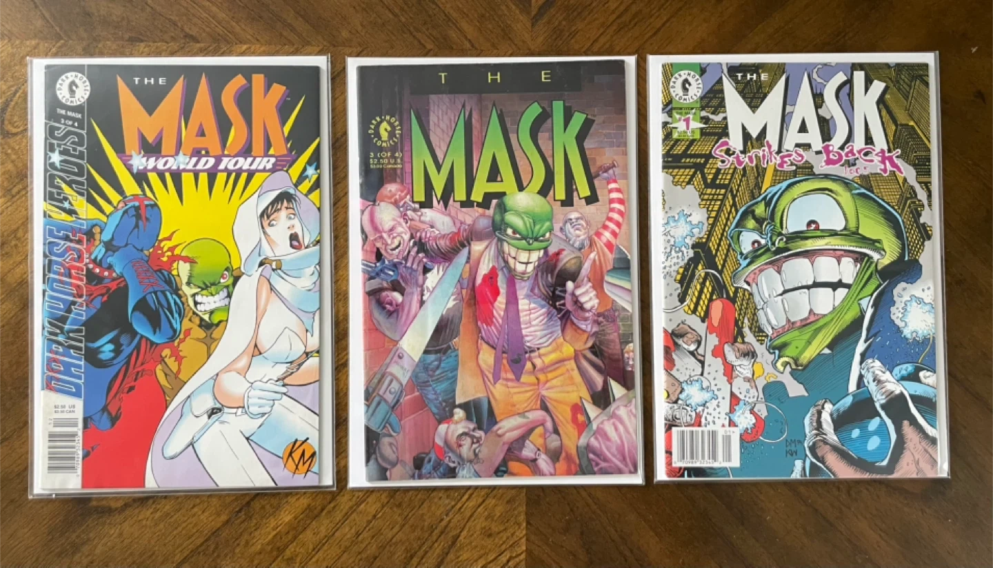 Three The Mask comic books are included: World Tour, The Mask (issue 3 of 4), and The Mask Strikes Back (issue 1). These are Dark Horse Comics. 5$each
