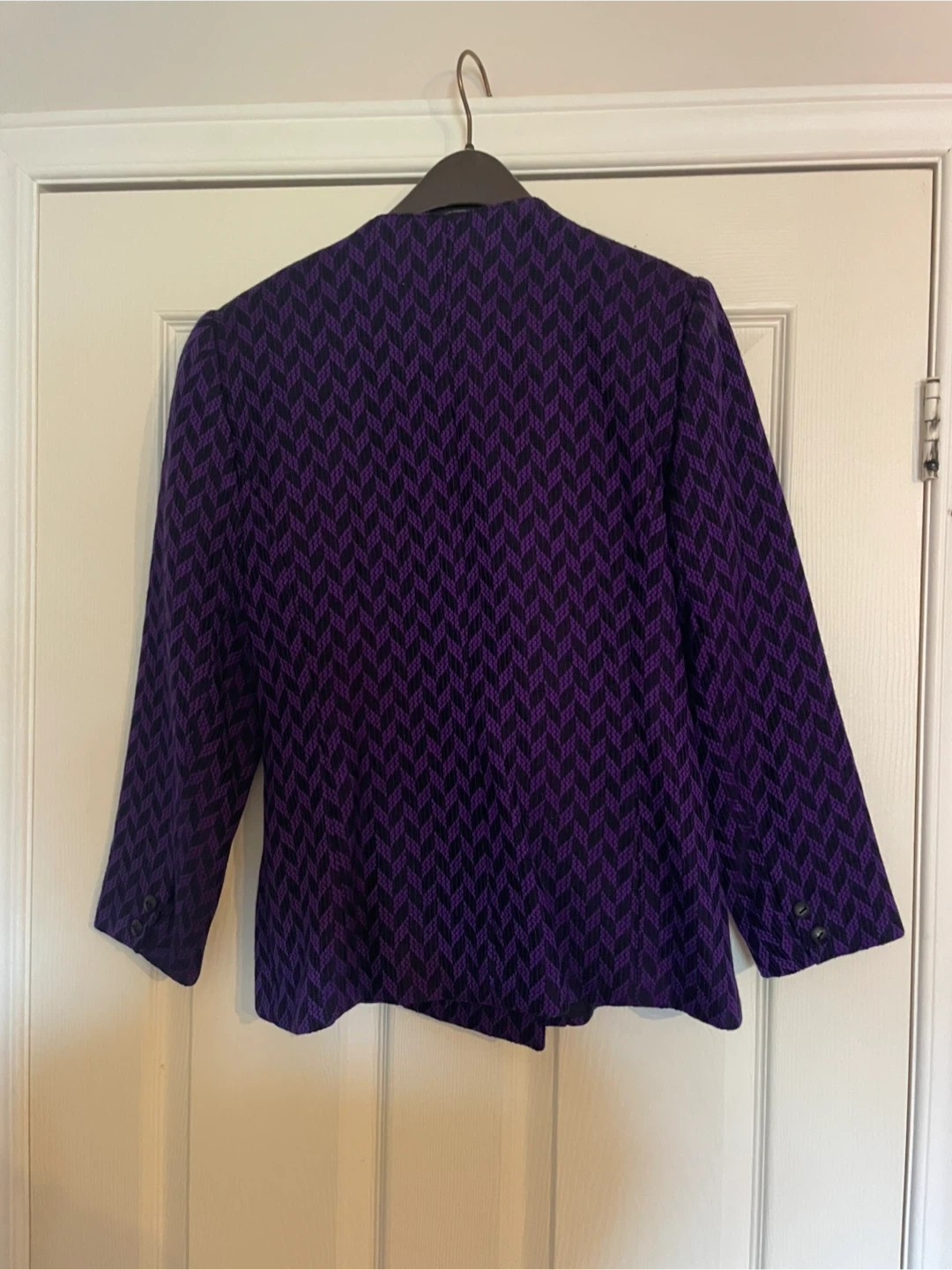 Selling a stylish Petites de Hobnobber blazer in a striking purple and black pattern. It's a size 3/4 (fits like a 6 or small) and in great condition. Perfect for adding a pop of colour to your wardrobe!