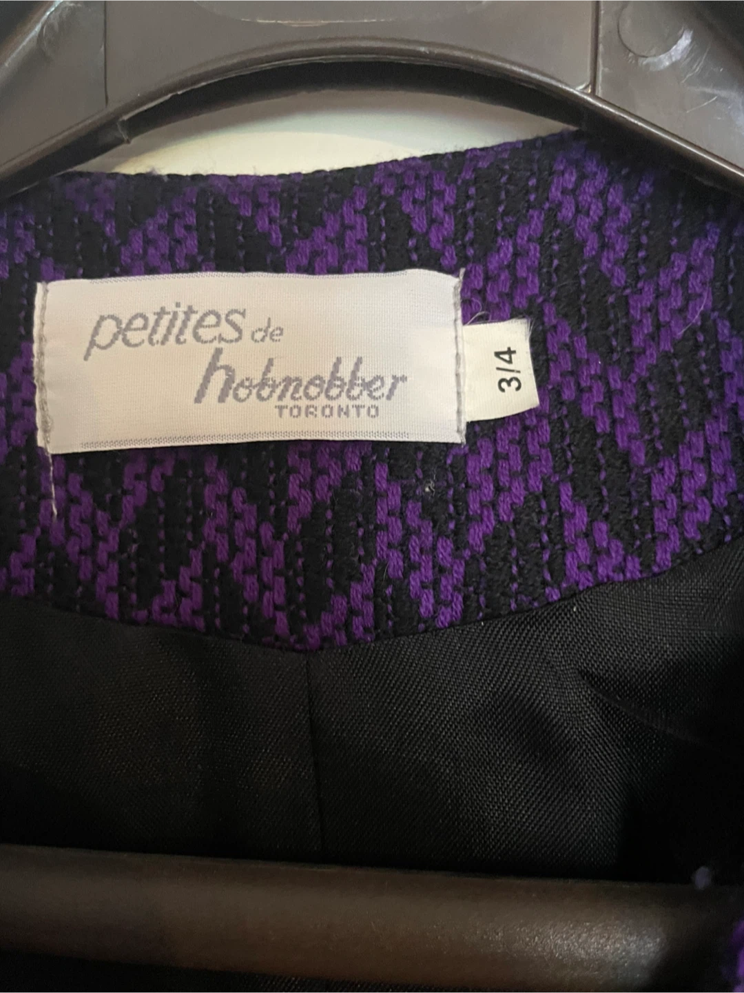 Selling a stylish Petites de Hobnobber blazer in a striking purple and black pattern. It's a size 3/4 (fits like a 6 or small) and in great condition. Perfect for adding a pop of colour to your wardrobe!