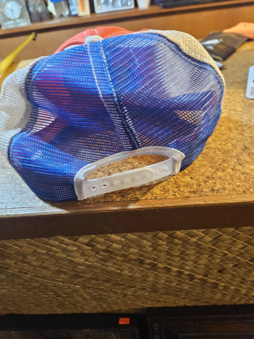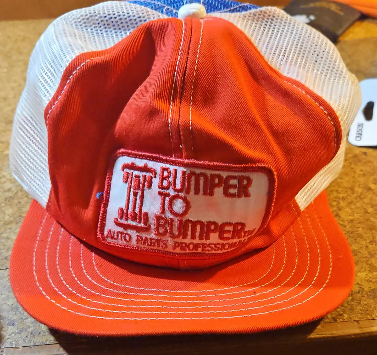 Red, white, and blue trucker hat with 'Bumper to Bumper' embroidery. Made in Canada from 25% polyester, 25% cotton, and 50% nylon. Adjustable snapback closure.