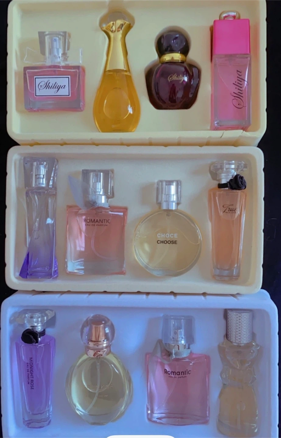 This Shiliya perfume set includes various scents for women. It features fragrances like Midnight Rose, Romantic, and True. These Eau de Parfum bottles offer a selection of aromas.