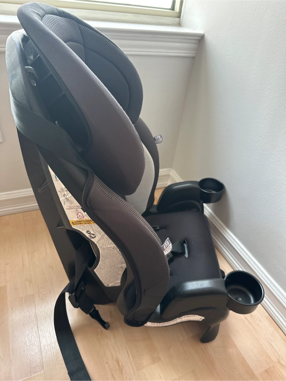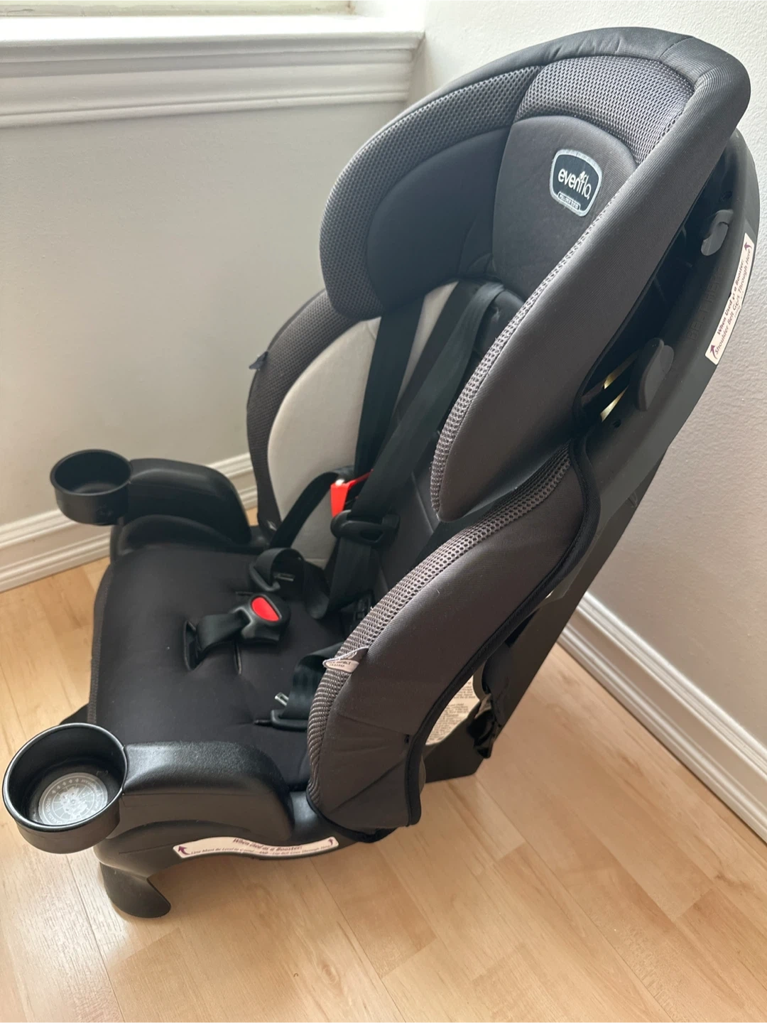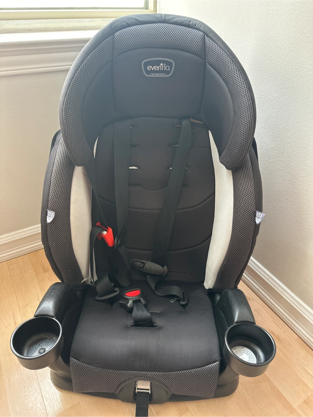 This is an Evenflo car seat. It features side impact testing and includes two convenient cup holders. It's designed for safety and comfort for young passengers. For children up to 6 years old or 18 kg.