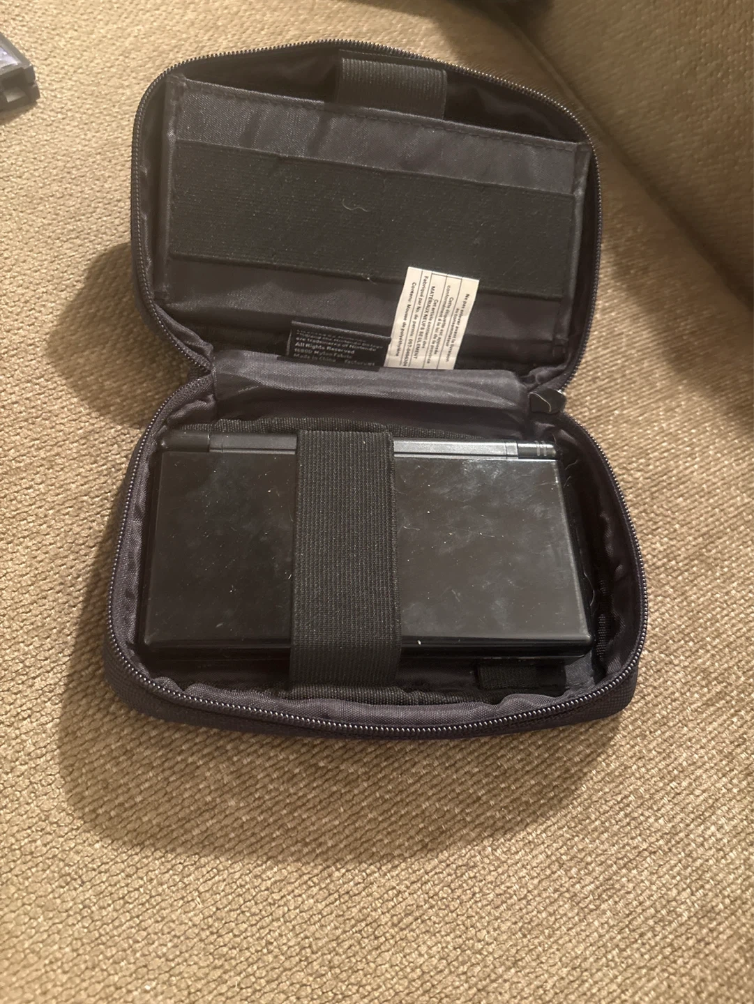 Black Nintendo DS Lite console. It comes with a black protective carrying case. Great for gaming on the go! No cable