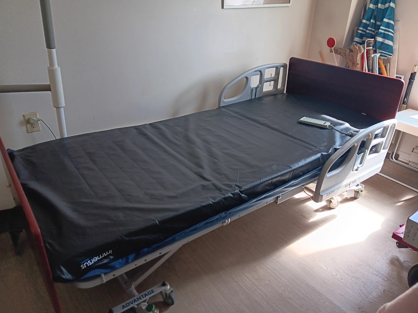 This is a SPAN electric hospital bed with a handheld remote. It's designed for patient comfort and care. Weight capacity is 500 lbs.