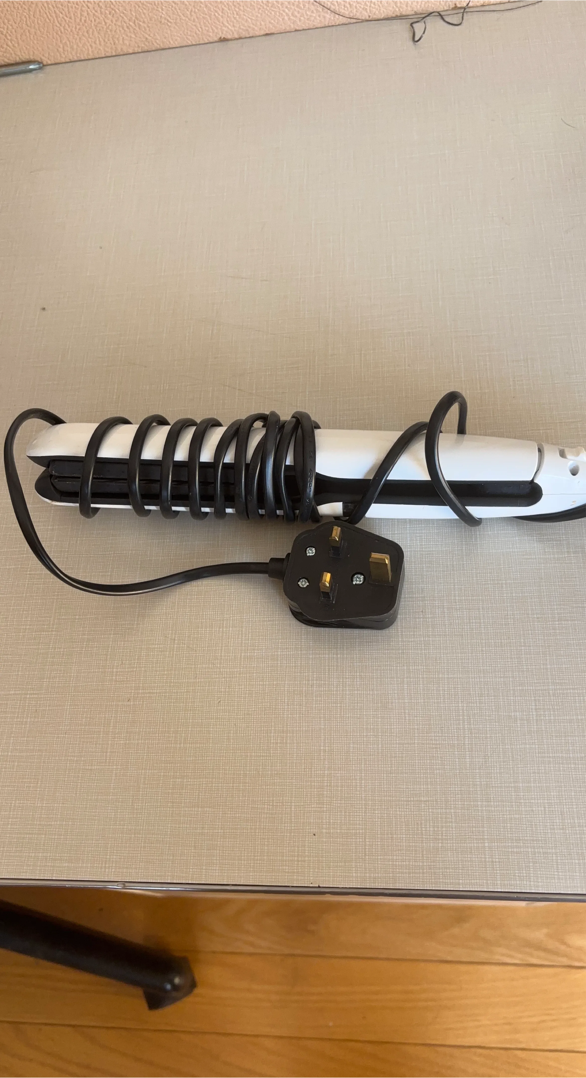 White hair straightener with a black cord and plug. The cord is wrapped neatly around the unit. Ready to use!