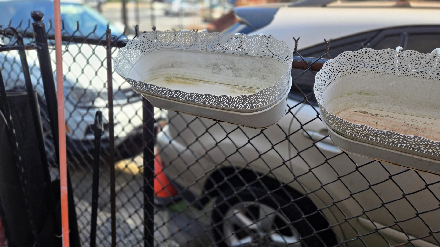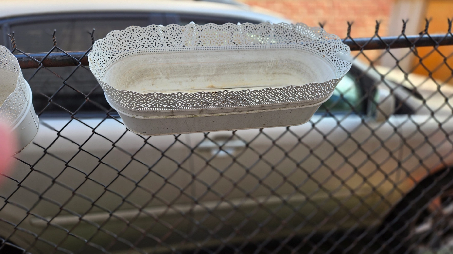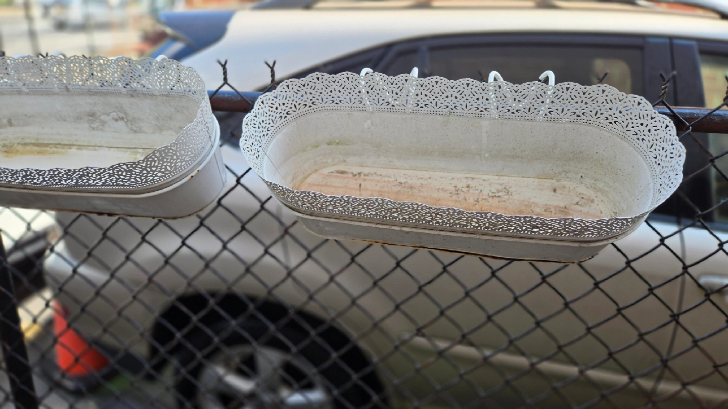 I'm selling a set of two hanging flower planters. They are white and have a decorative lace-like trim. Perfect for adding a touch of charm to your garden or balcony!