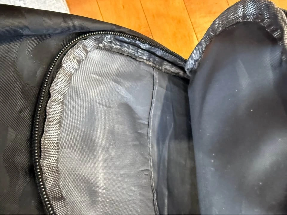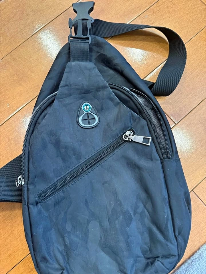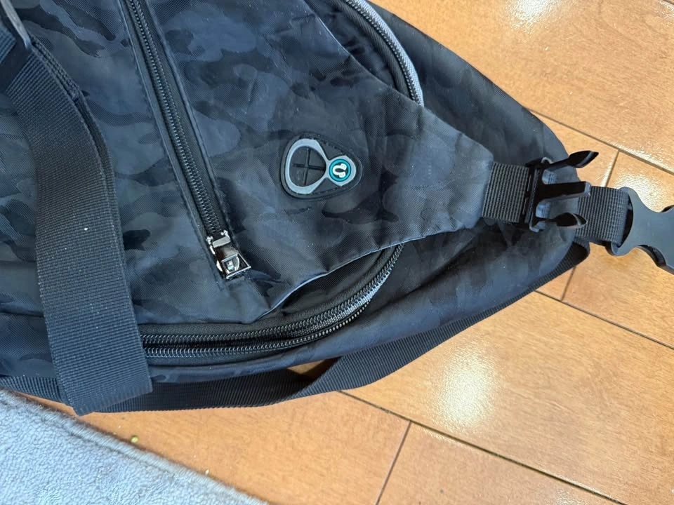 Clean black sling bag with a cool camo pattern. Features multiple zippered pockets and an adjustable strap with a buckle. Good for daily use or when you're out and about.