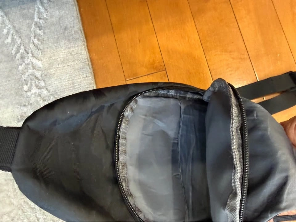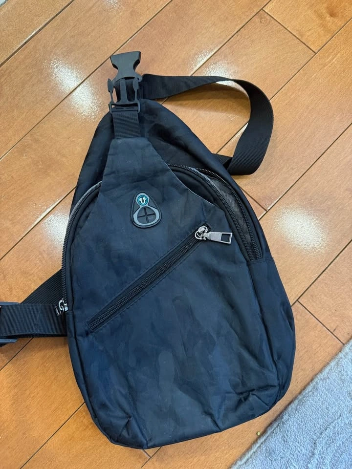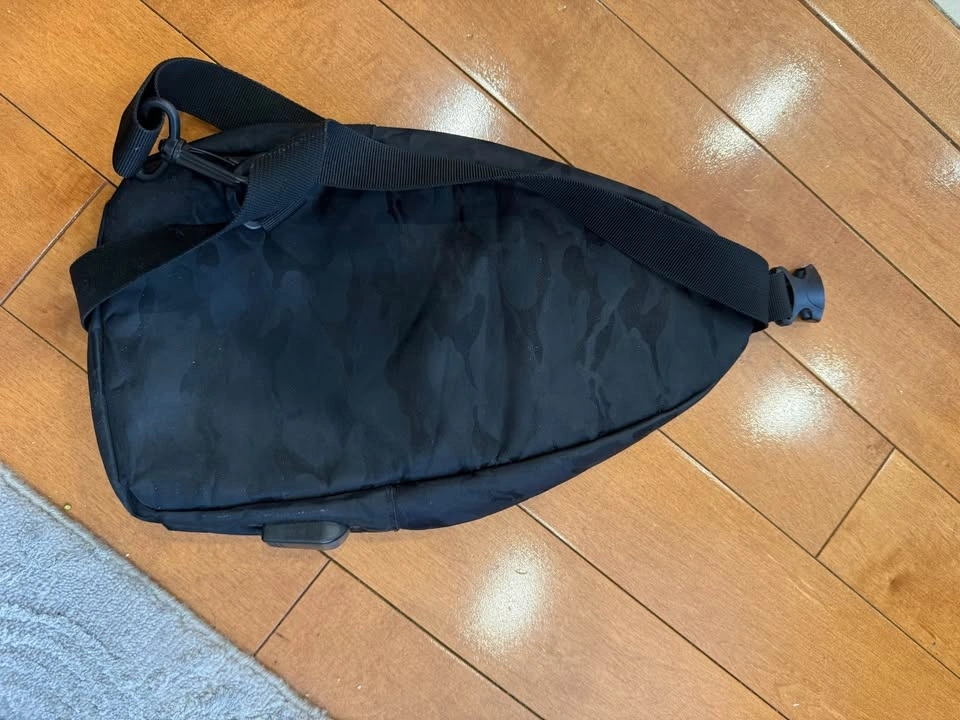Clean black sling bag with a cool camo pattern. Features multiple zippered pockets and an adjustable strap with a buckle. Good for daily use or when you're out and about.